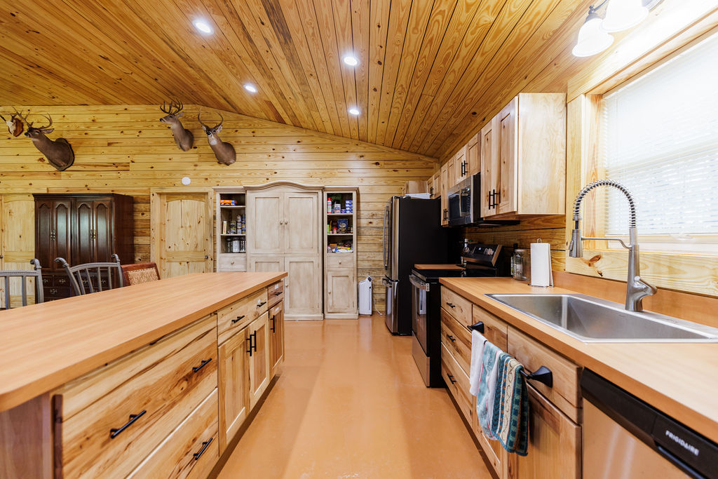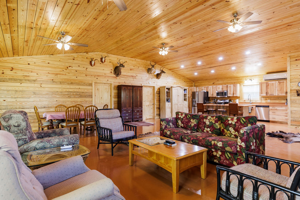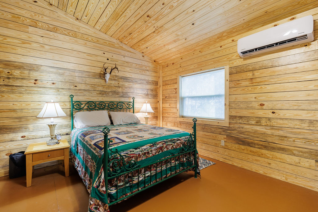 Designed by the owner and built with efficiency and comfort in mind, the 2BD lodge features two identical master suites and an open, vaulted living area perfect for entertaining. With R-38 insulation in the roof, R-22 spray-foam walls, and energy-efficient mini-split systems, the home remains cool in summer and cozy through Alabama’s cold, crisp hunting season.