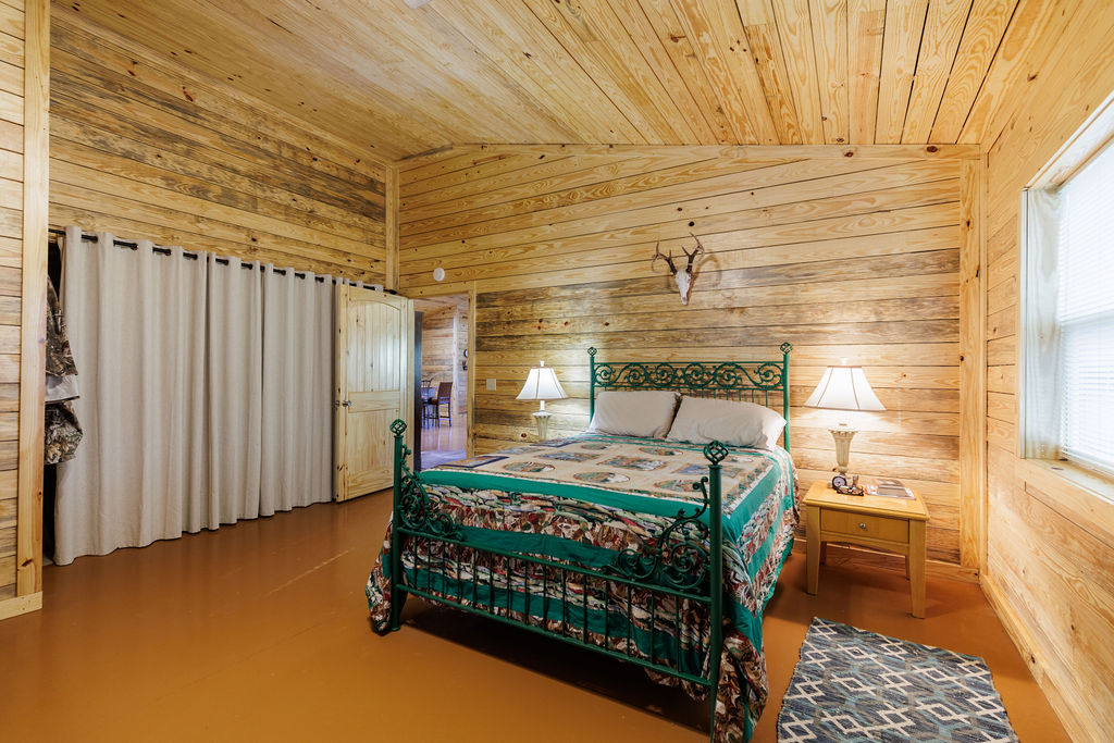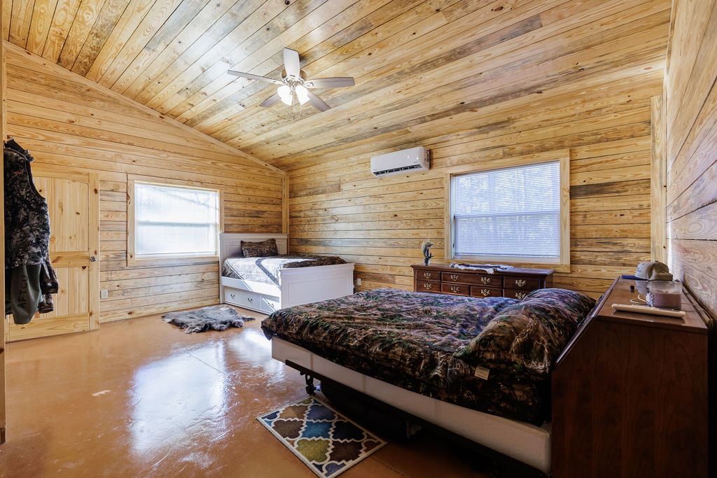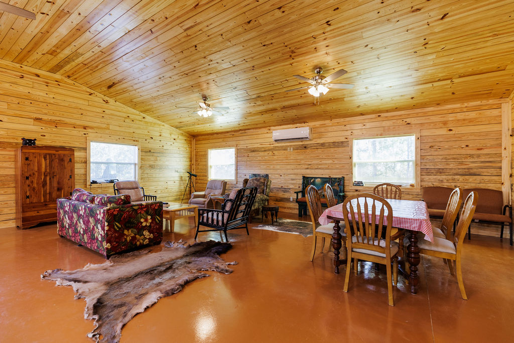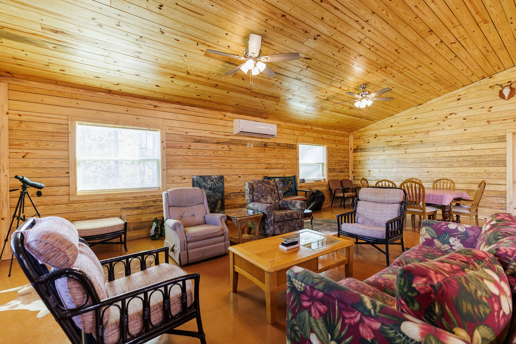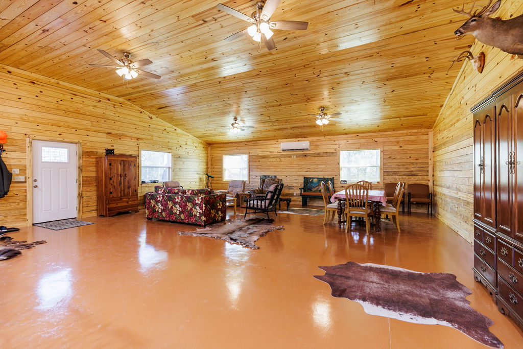 Designed for both efficiency and comfort, the lodge features two identical master suites and an open, vaulted living area perfect for entertaining. Constructed with R-38 insulation in the roof, R-22 spray-foam walls, and energy-efficient mini-split systems, the lodgte remains cool in summer and cozy through Alabama’s crisp hunting season.