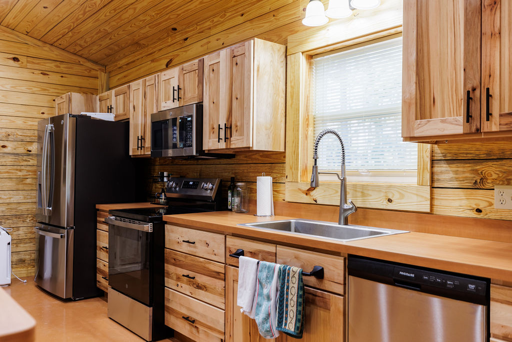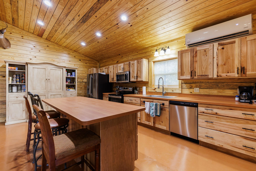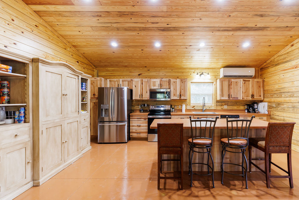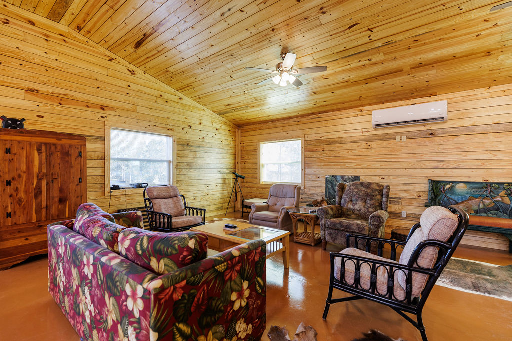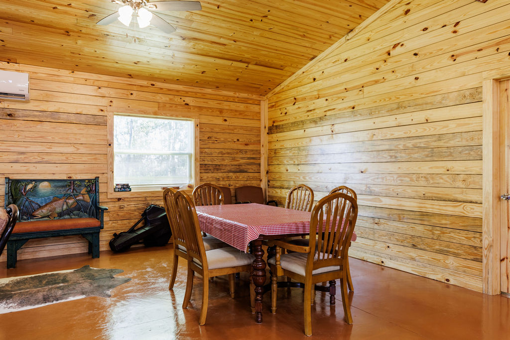 Designed for both efficiency and comfort, the lodge features two identical master suites and an open, vaulted living area perfect for entertaining. Constructed with R-38 insulation in the roof, R-22 spray-foam walls, and energy-efficient mini-split systems, the lodgte remains cool in summer and cozy through Alabama’s crisp hunting season.
