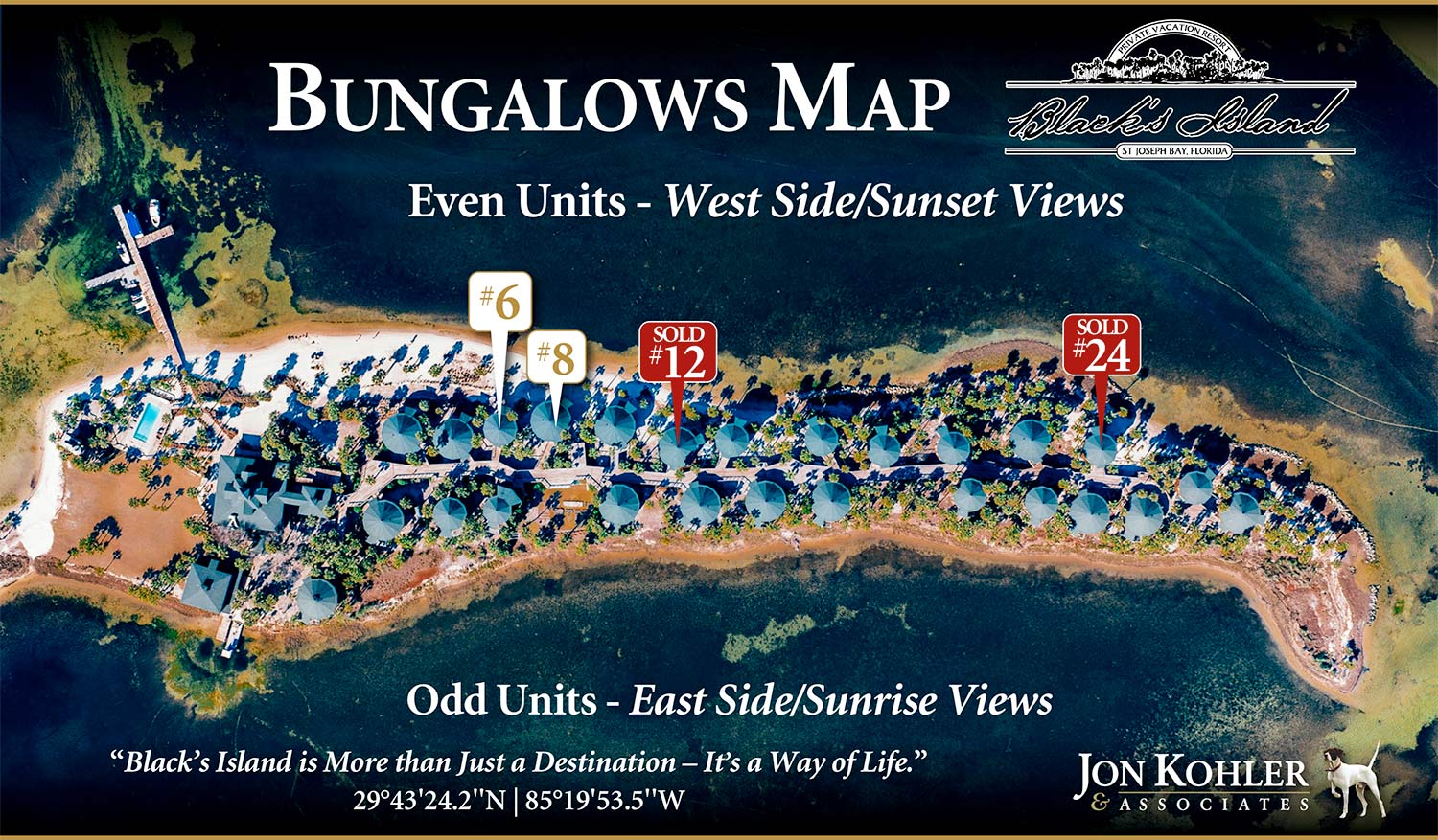 - In all there are 26 private beachfront bungalows on Black’s Island (currently, One story bungalow available at $1.25M and two story at $1.35M)