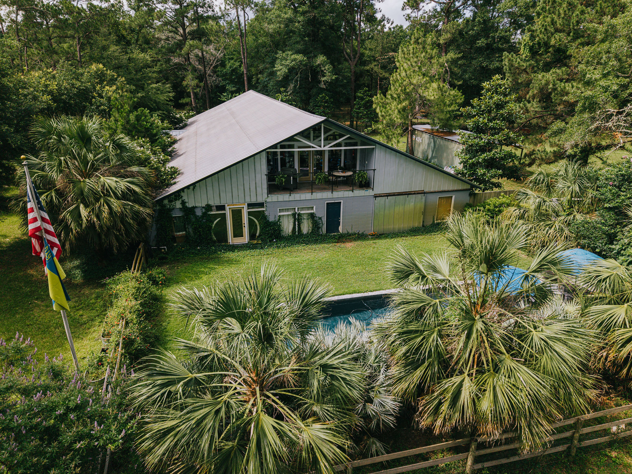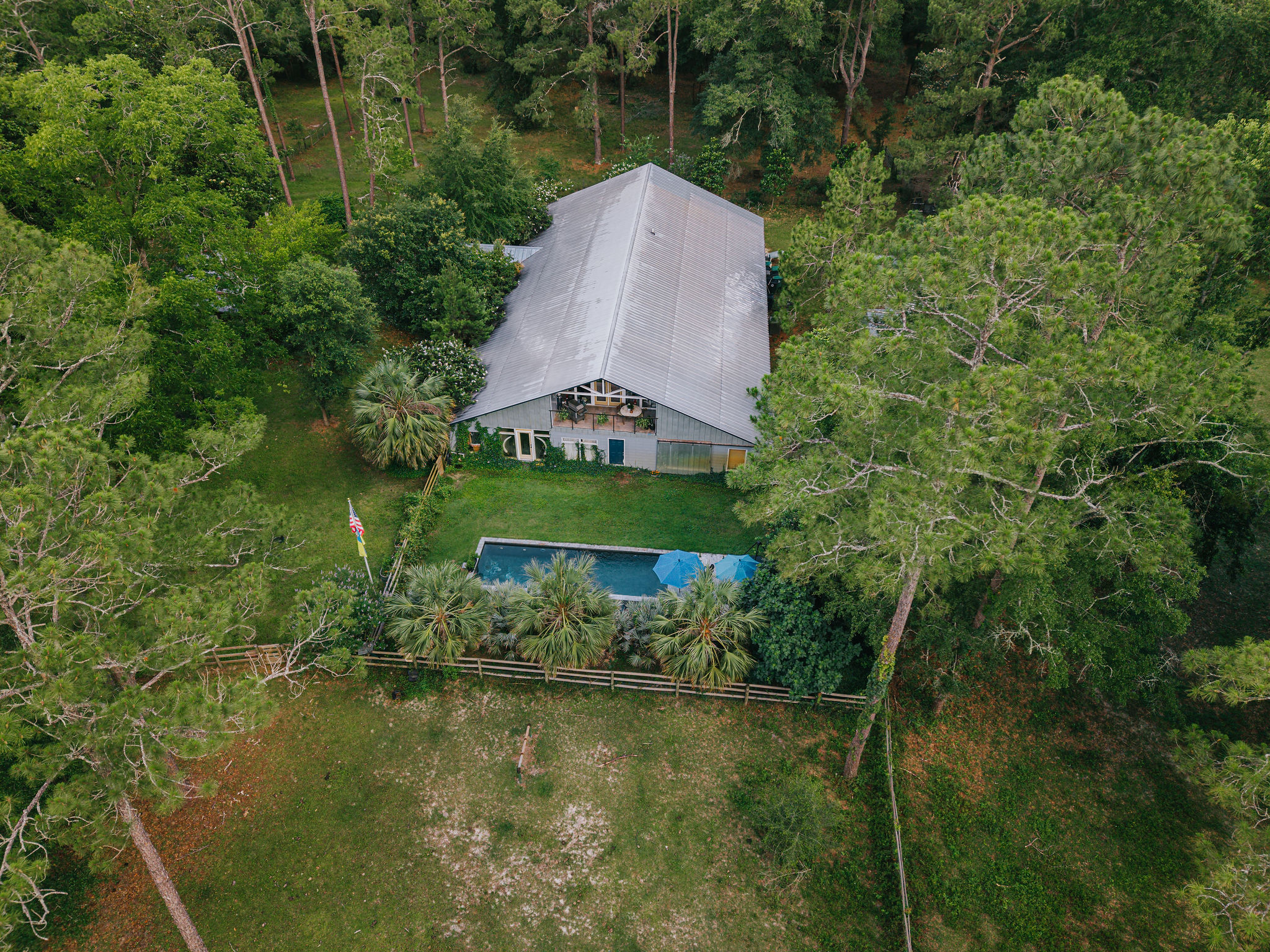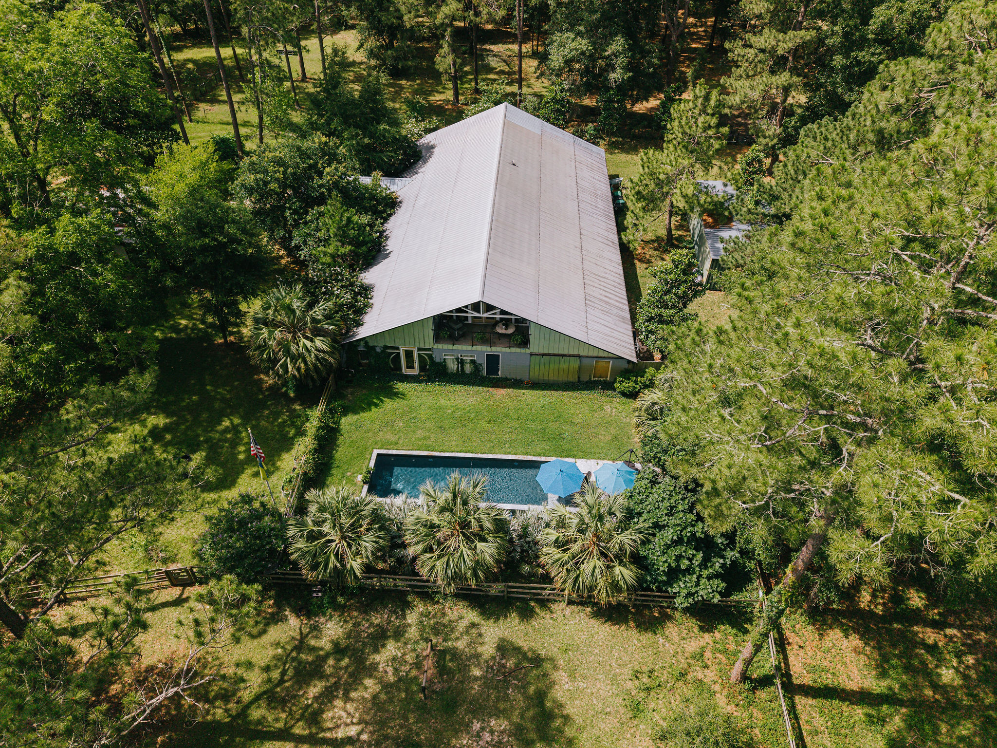 While the property’s hunting opportunities are exceptional, Bradford Brook is designed for all-season enjoyment. The gourmet kitchen is a chef’s dream, equipped with top-of-the-line stainless steel appliances, elegant cabinetry, granite countertops, and a generous island that doubles as a gathering spot for friends and family. Whether preparing everyday meals or hosting dinner parties, this kitchen elevates the experience. Upstairs, a spacious balcony and sun room provide an ideal vantage point to watch deer graze in the fields or to savor your morning coffee. Beyond the impressive interior, the property invites you to embrace the Florida outdoor lifestyle to its fullest. A new pool and expansive patio area create the ultimate backyard oasis — perfect for lazy summer afternoons, family barbecues, or evening swims under the stars. Bradford Brook makes for the ultimate hunting camp or full-time secluded residence. The other half of the barndominium is a working horse stable and storage.