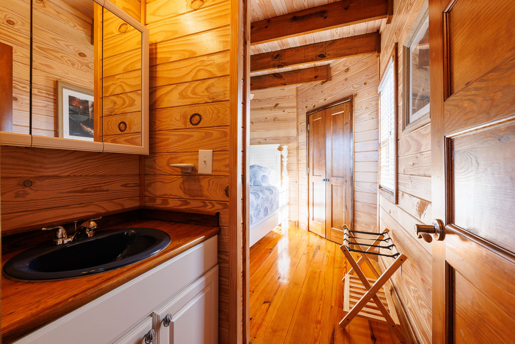 The 1,906± square-foot custom home blends comfort with timeless coastal craftsmanship. Hardwood floors, cedar walls, and exposed pine and oak beams create a warm lodge-like atmosphere throughout the home. Custom yellow pine interior doors with cherry and walnut trim add distinctive character and detail.