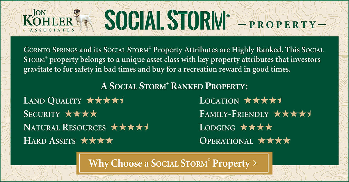 Gornto Spring's Social Storm™ Property Attributes are highly ranked. This Social Storm™ property belongs to a unique asset class with key property attributes that investors gravitate to for safety in bad times and buy for a recreation reward in good times.