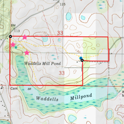 - A portion of the Historic and Spring fed 130 +/- acre lake “Waddell’s Mill Pond” is on this tract (Approx 20 +/- acres of the lake is on this Tract and 110 +/- acres of the lake is on Tract H)