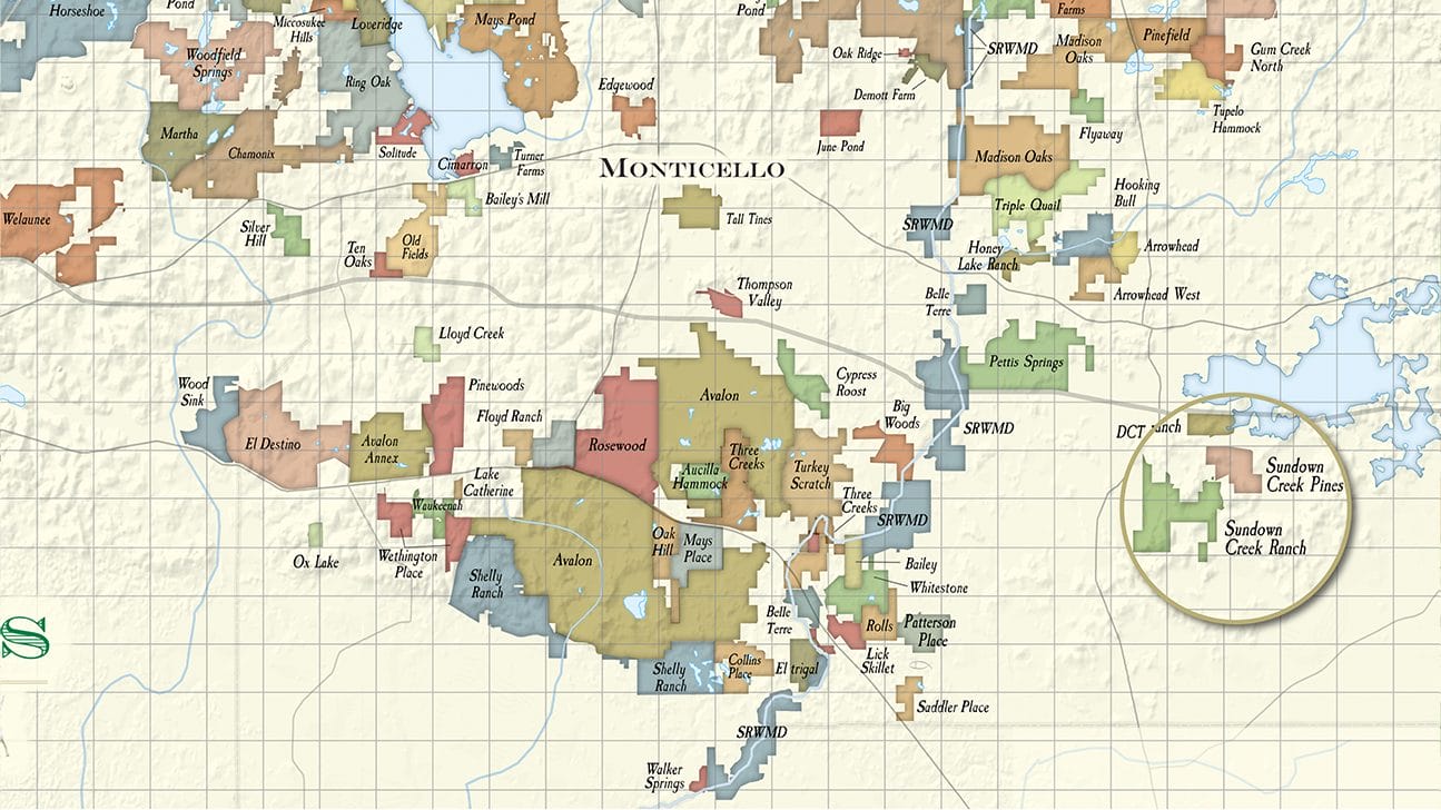 Conveniently located only 5 minutes from Interstate 10m, Sundown Cree Ranch is located approximately 17 miles from the quaint city of Madison, Florida, 24 miles to Monticello, Florida, 42 miles to Tallahassee, Florida, 44 miles West of Live Oak, and one hour to Valdosta, Georgia.