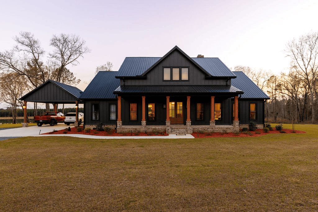 - 4,365 sq ft house (2,559 sq ft downstairs, 1,806 sq ft upstairs, 628 sq ft porches, 576 sq ft carport), 6 BD/4 Baths, built in 2024 with a metal roof; outdoor kitchen area; Fiber optic wifi; Rinnia on demand hot water heater; includes underground power for property; lawn irrigation