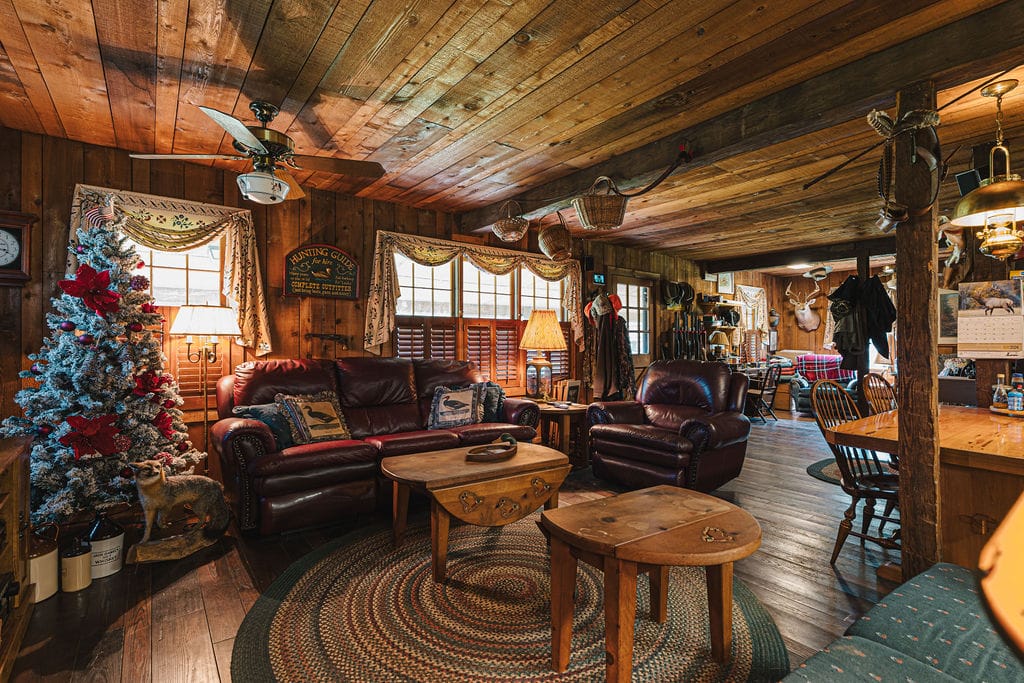 The owner’s cabin looks like it’s a century old with great original details in the fireplace and wood beams but modernized with details such as a Viking cooking range. One bathroom is completely walled with old tobacco stakes from local area barns. It features two bedrooms, two bathrooms, and a wraparound porch.