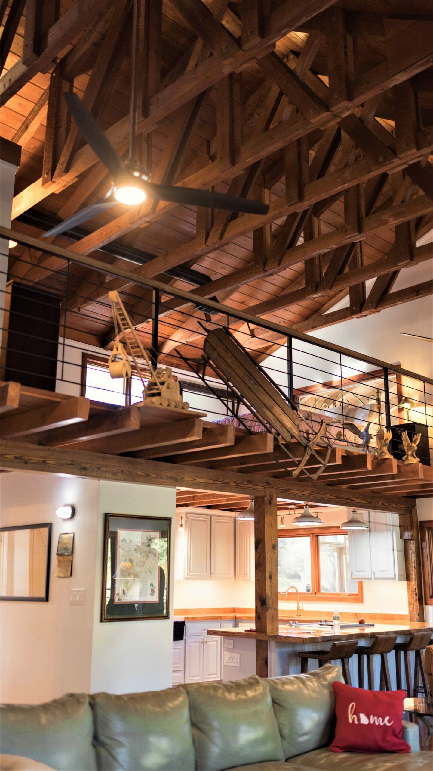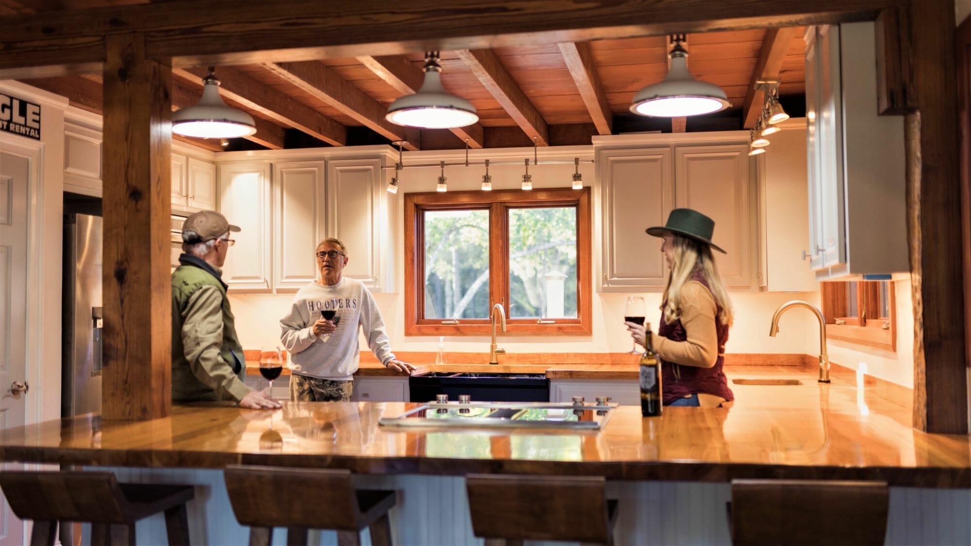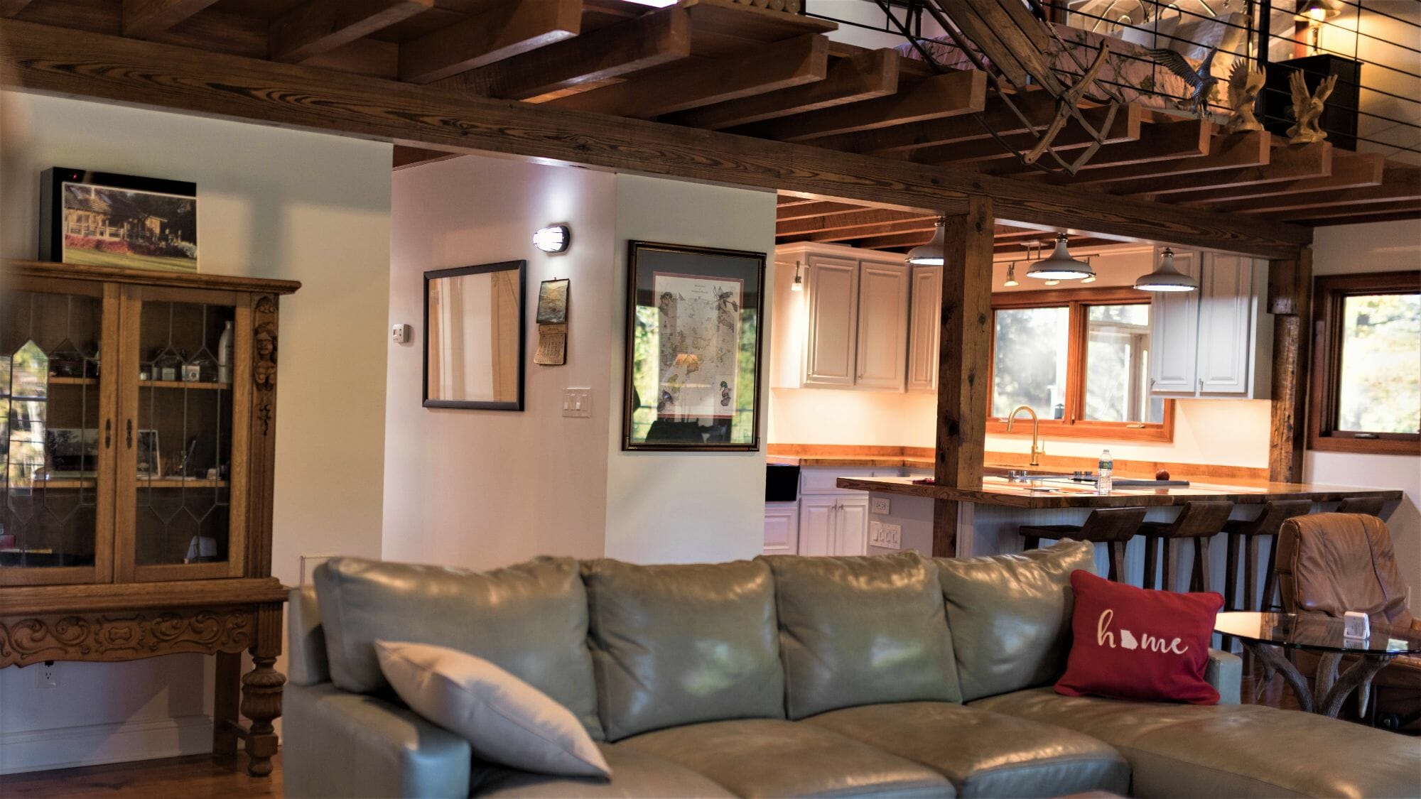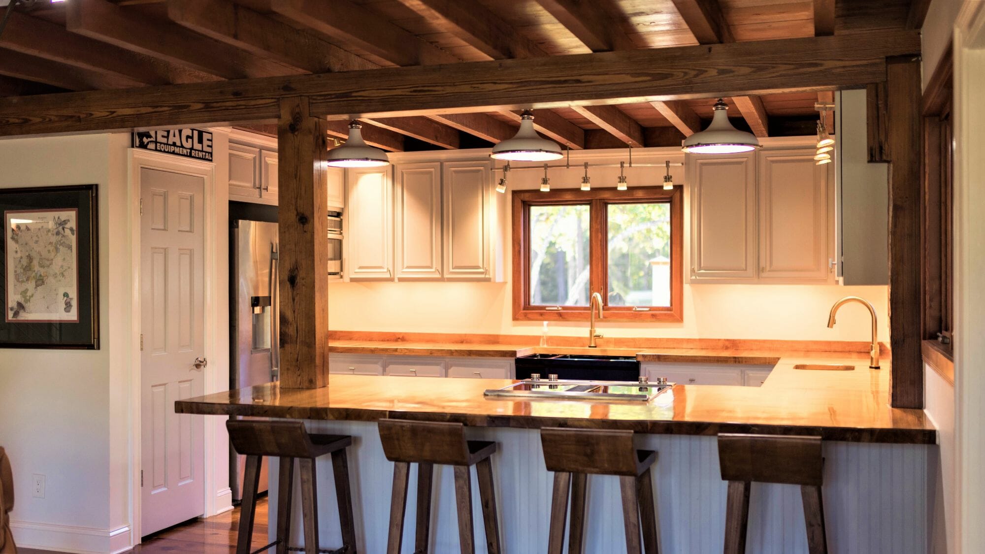 - Pine floors, walls, and countertops; exposed ceiling beams