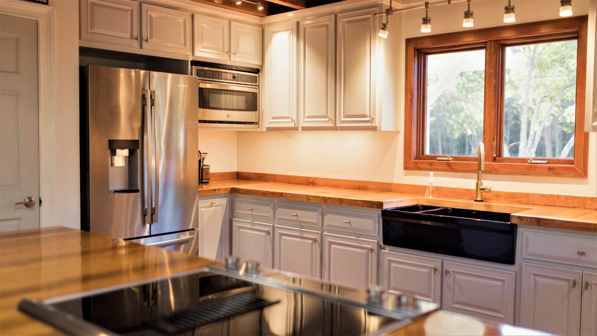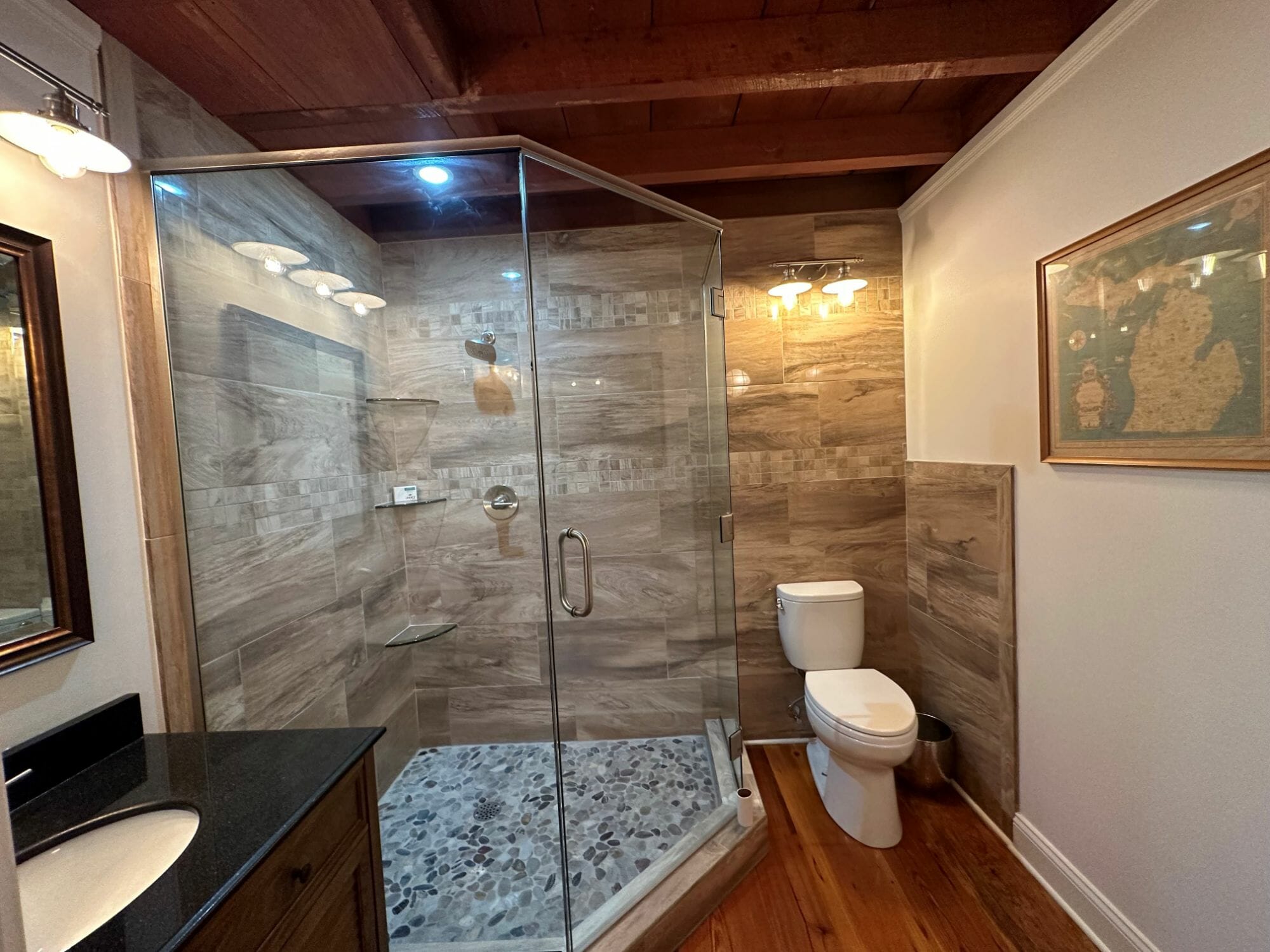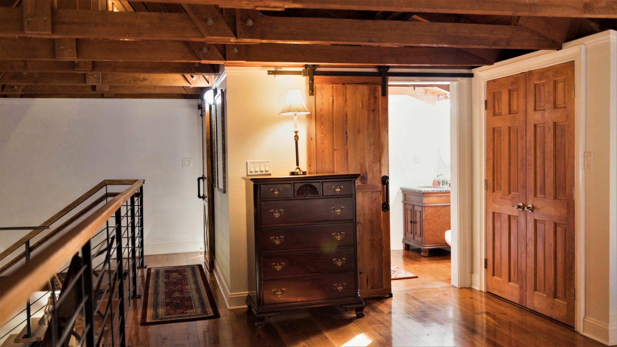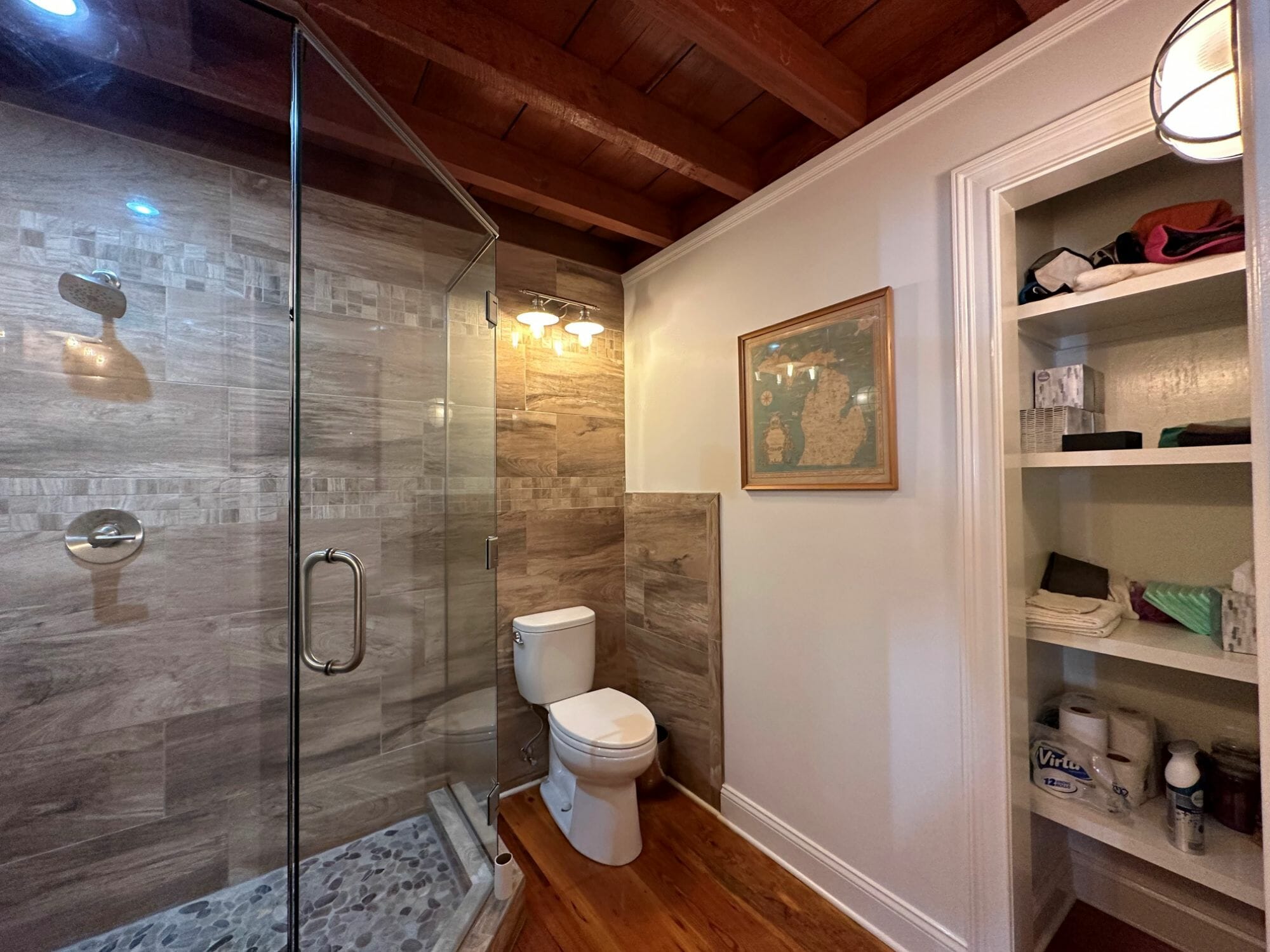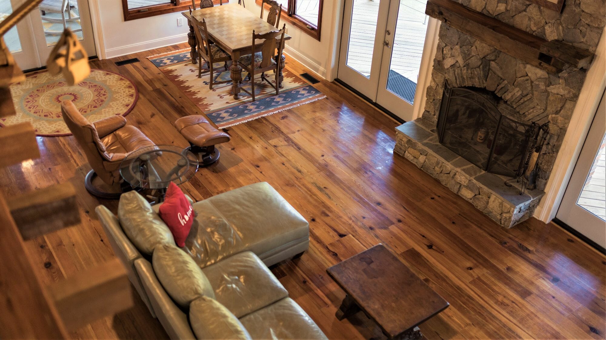 - Pine floors, walls, and countertops; exposed ceiling beams