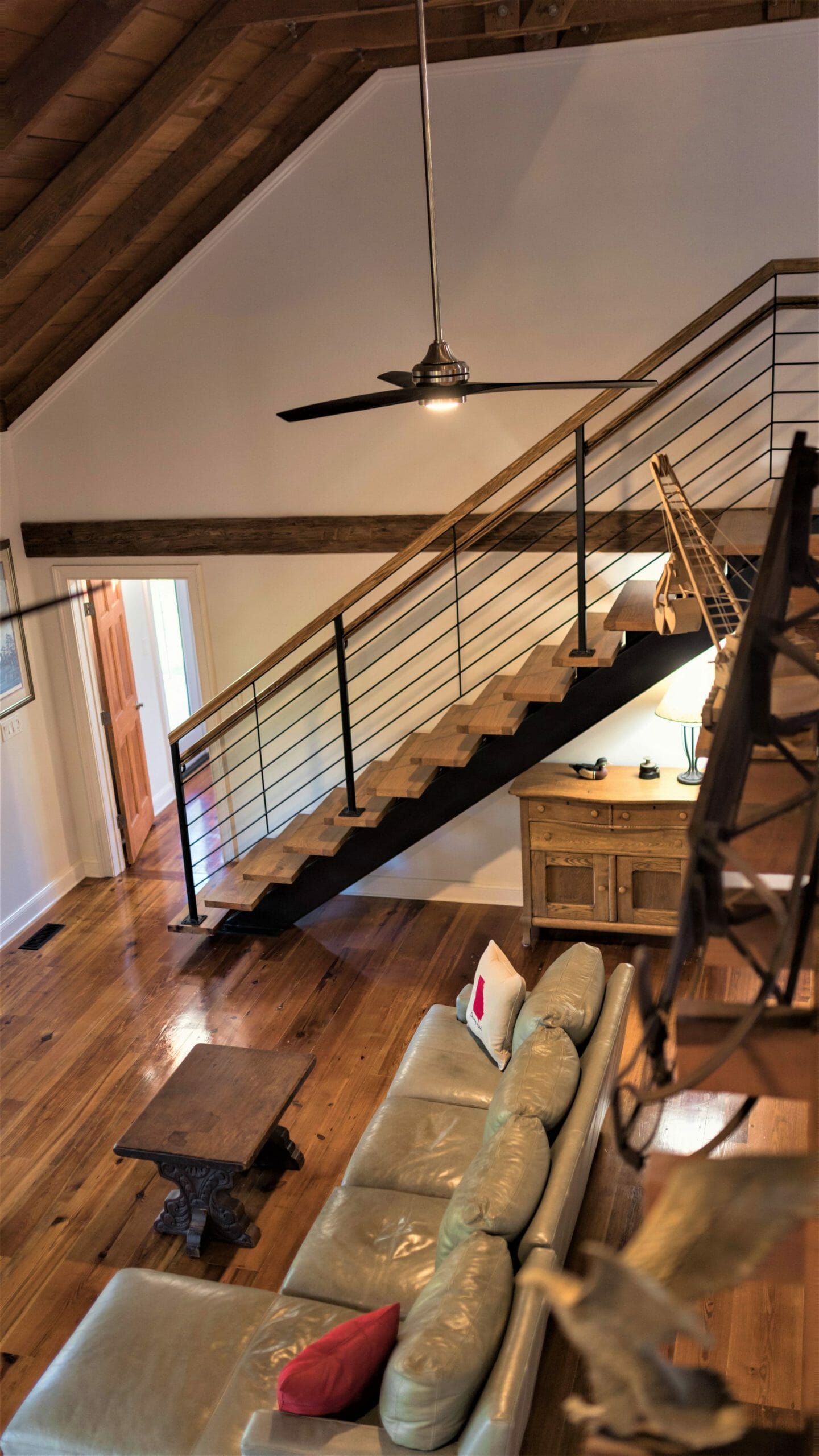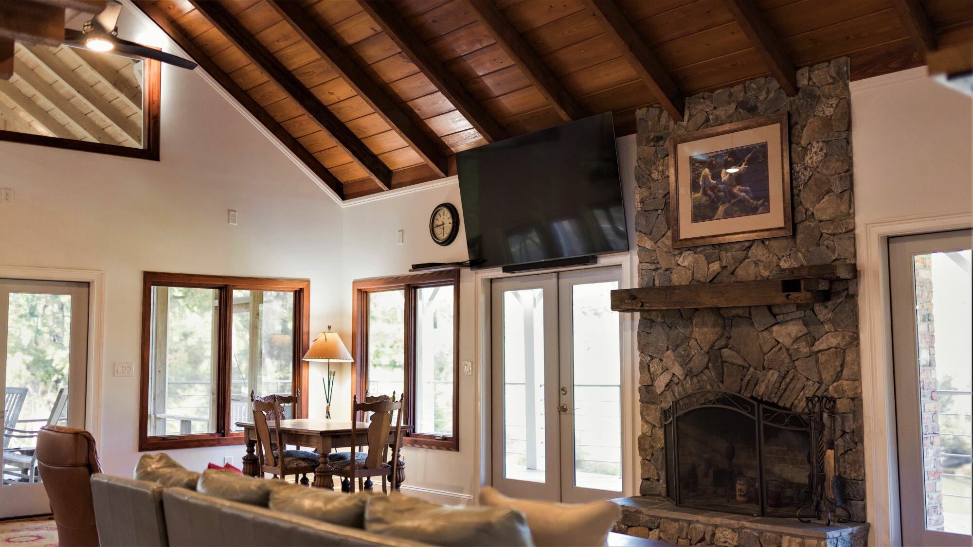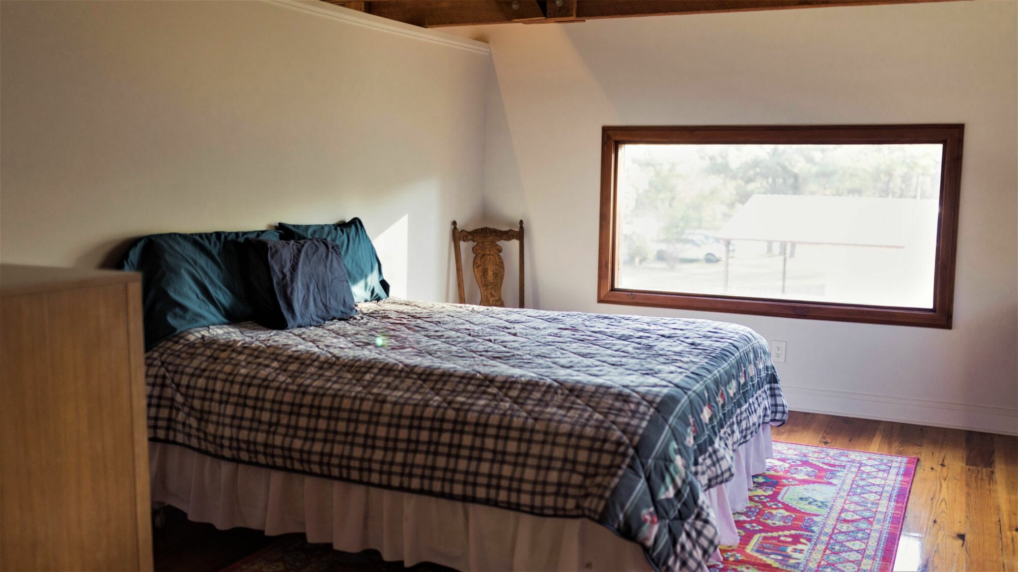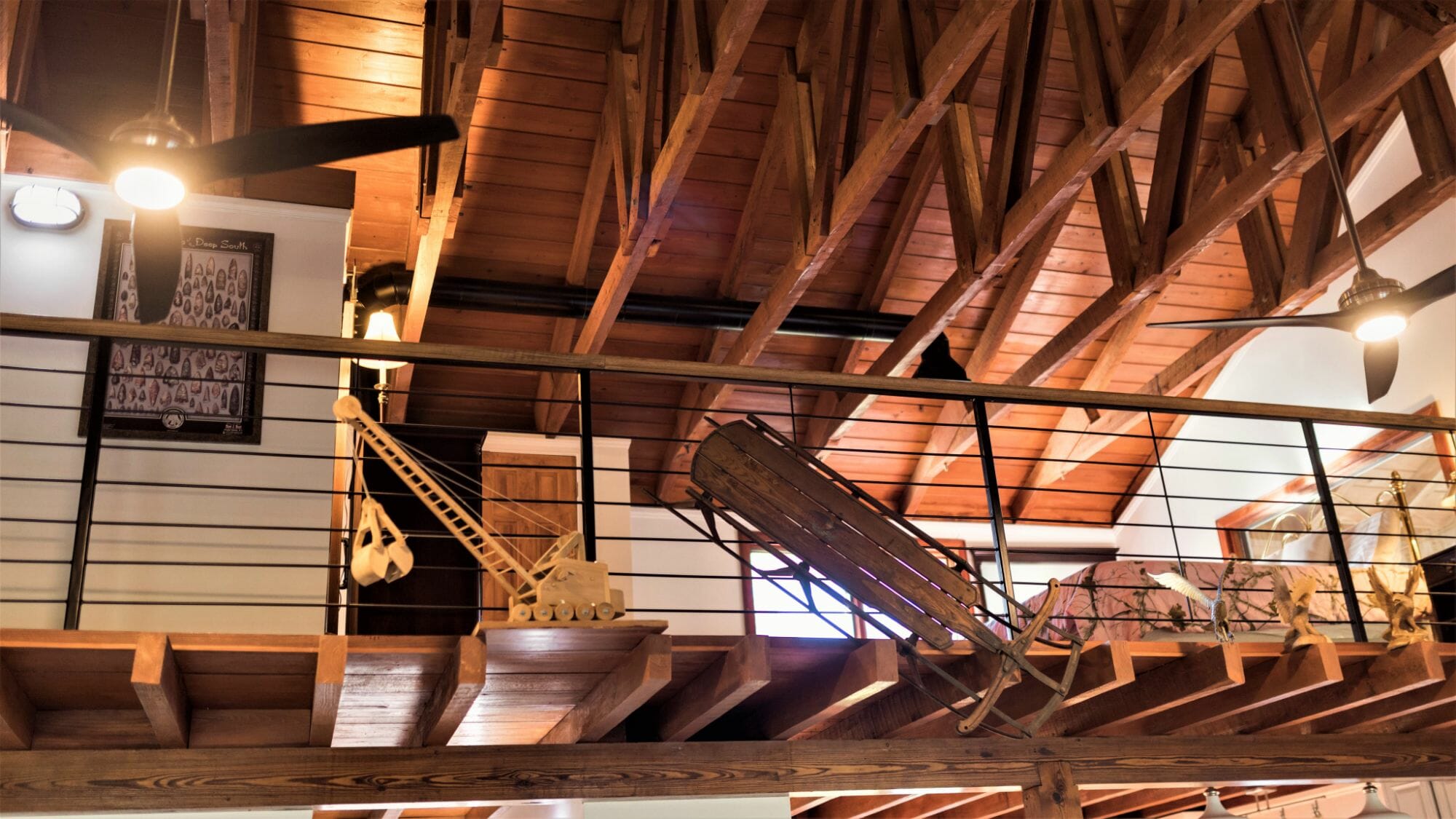 - Pine floors, walls, and countertops; exposed ceiling beams