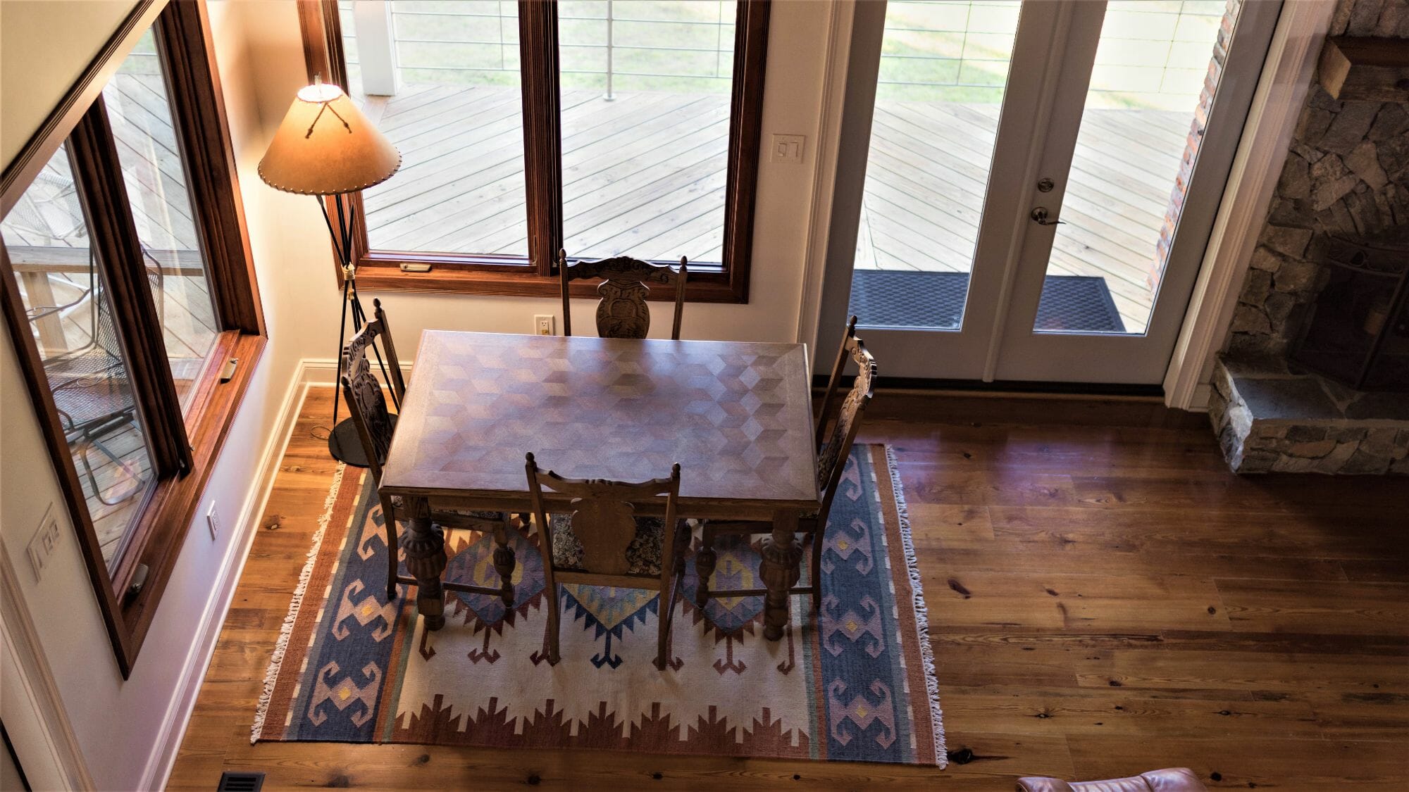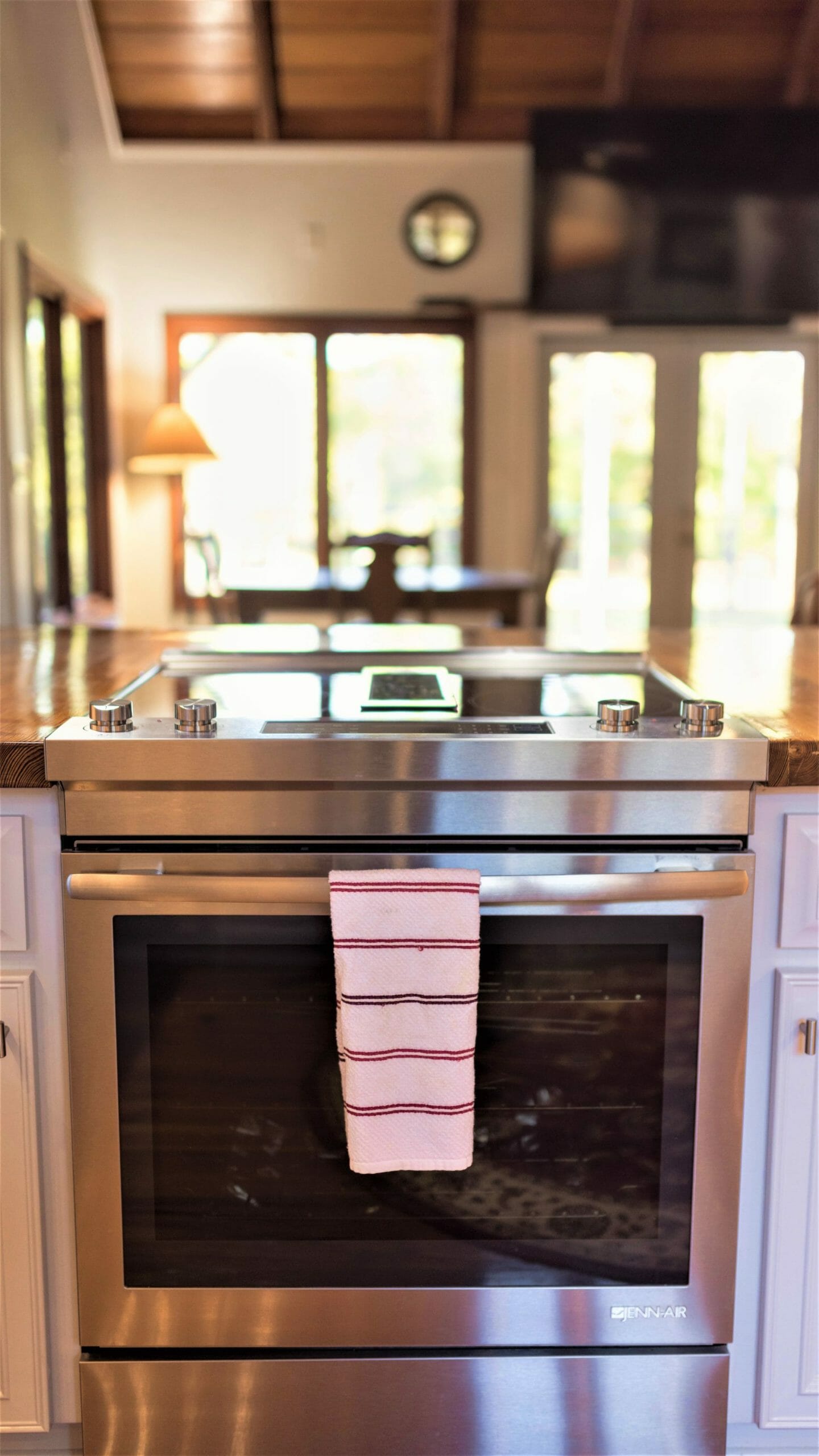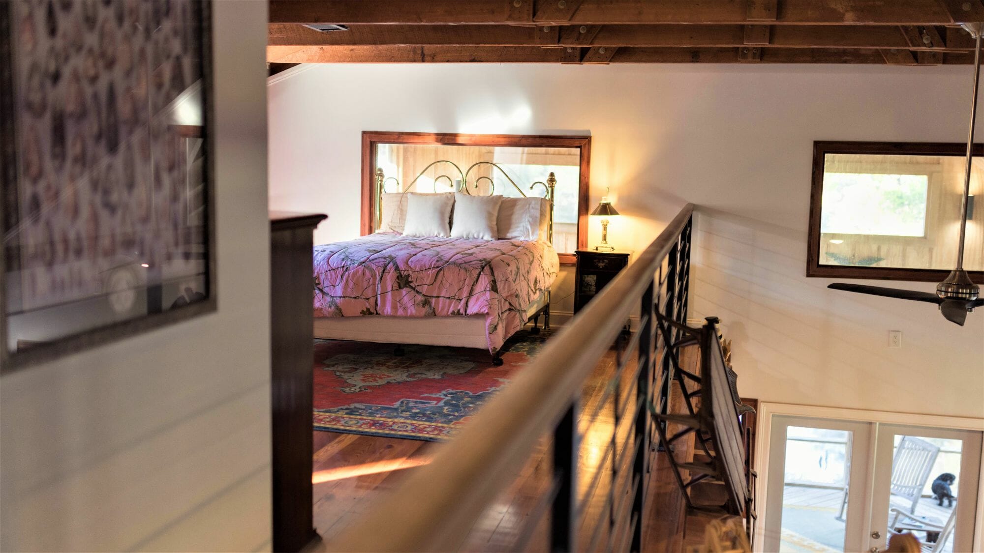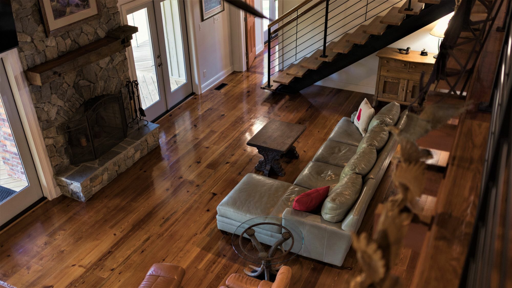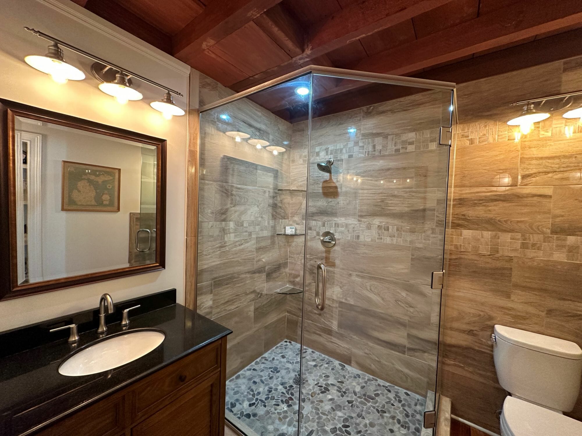 - Pine floors, walls, and countertops; exposed ceiling beams