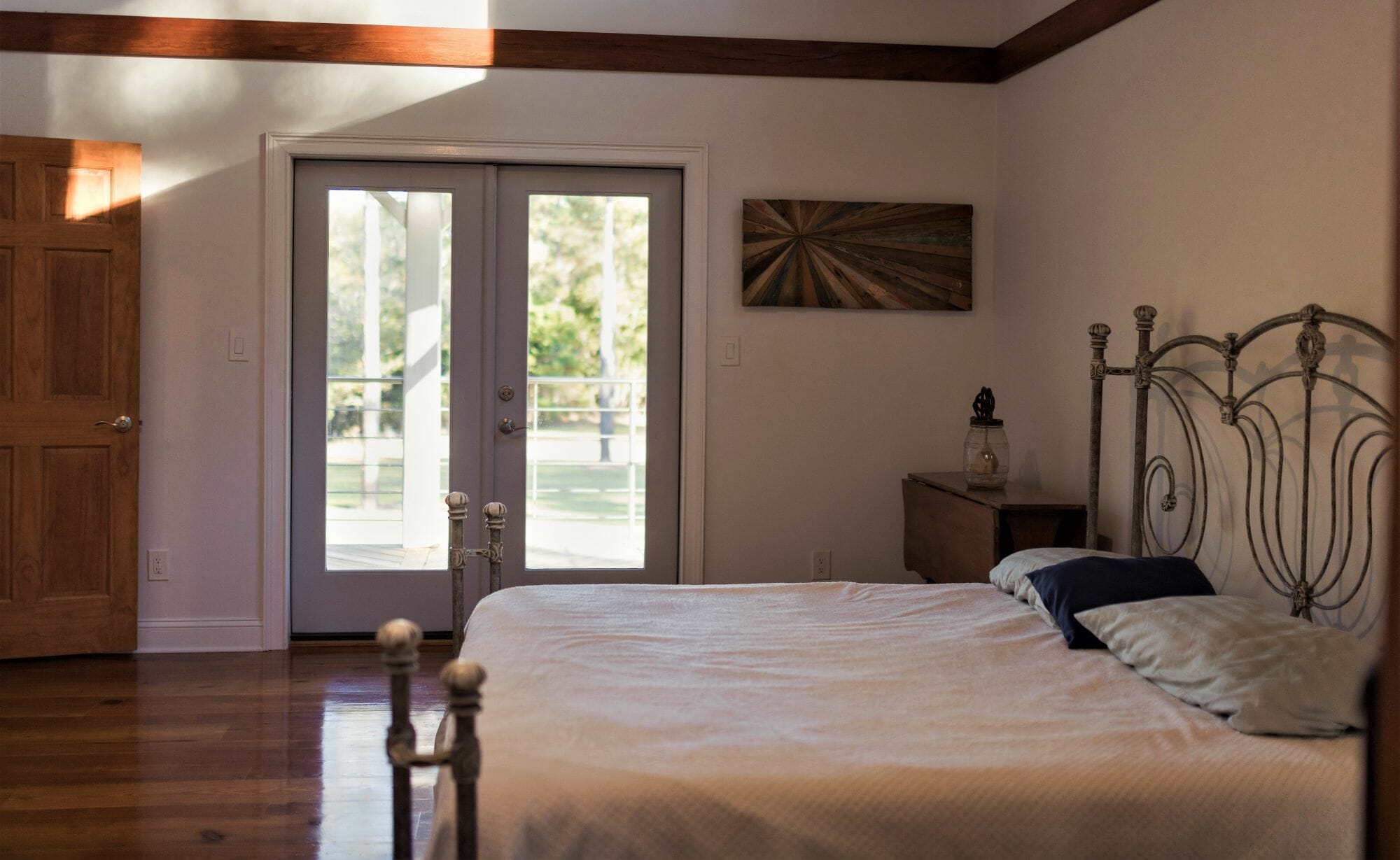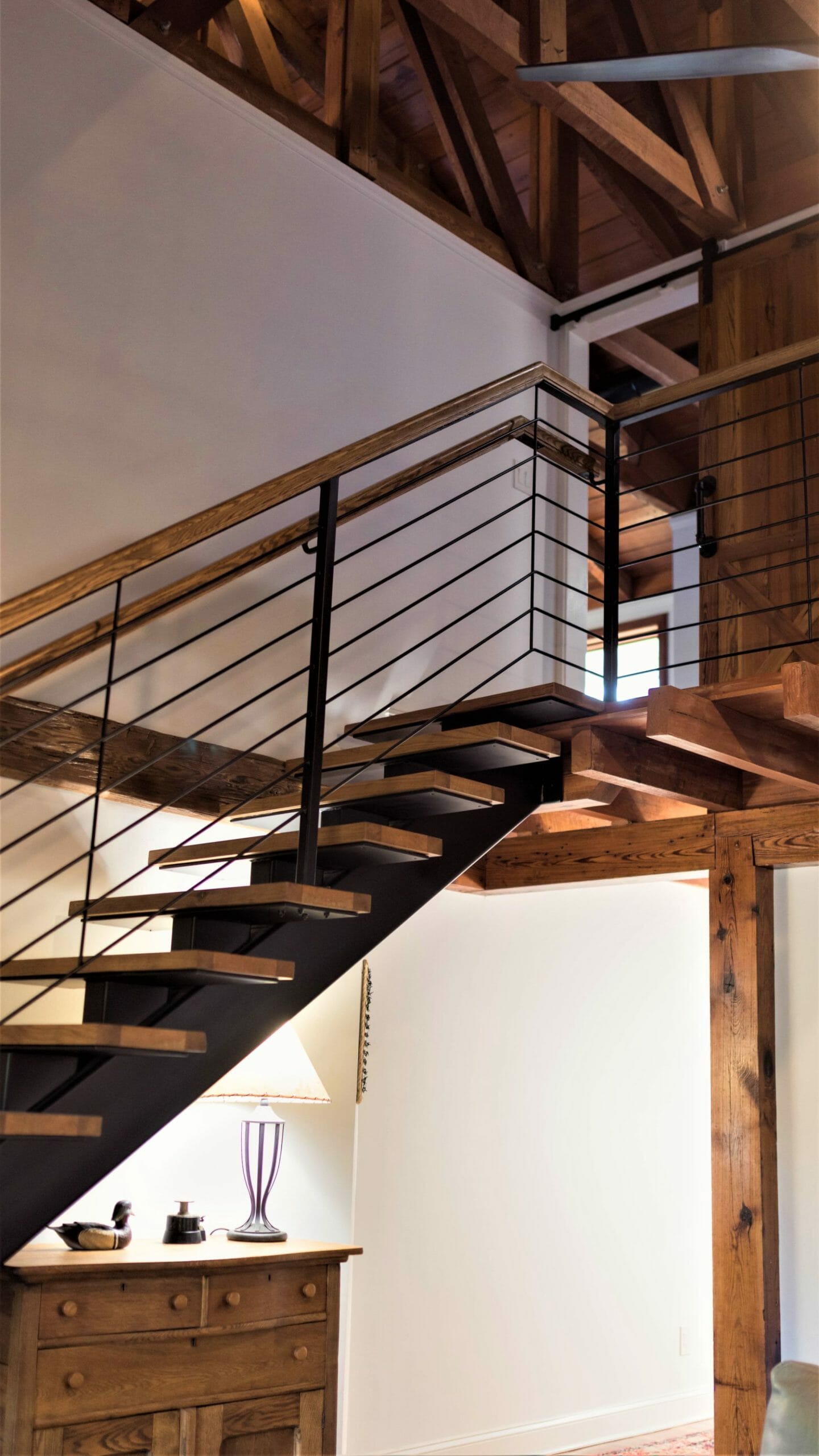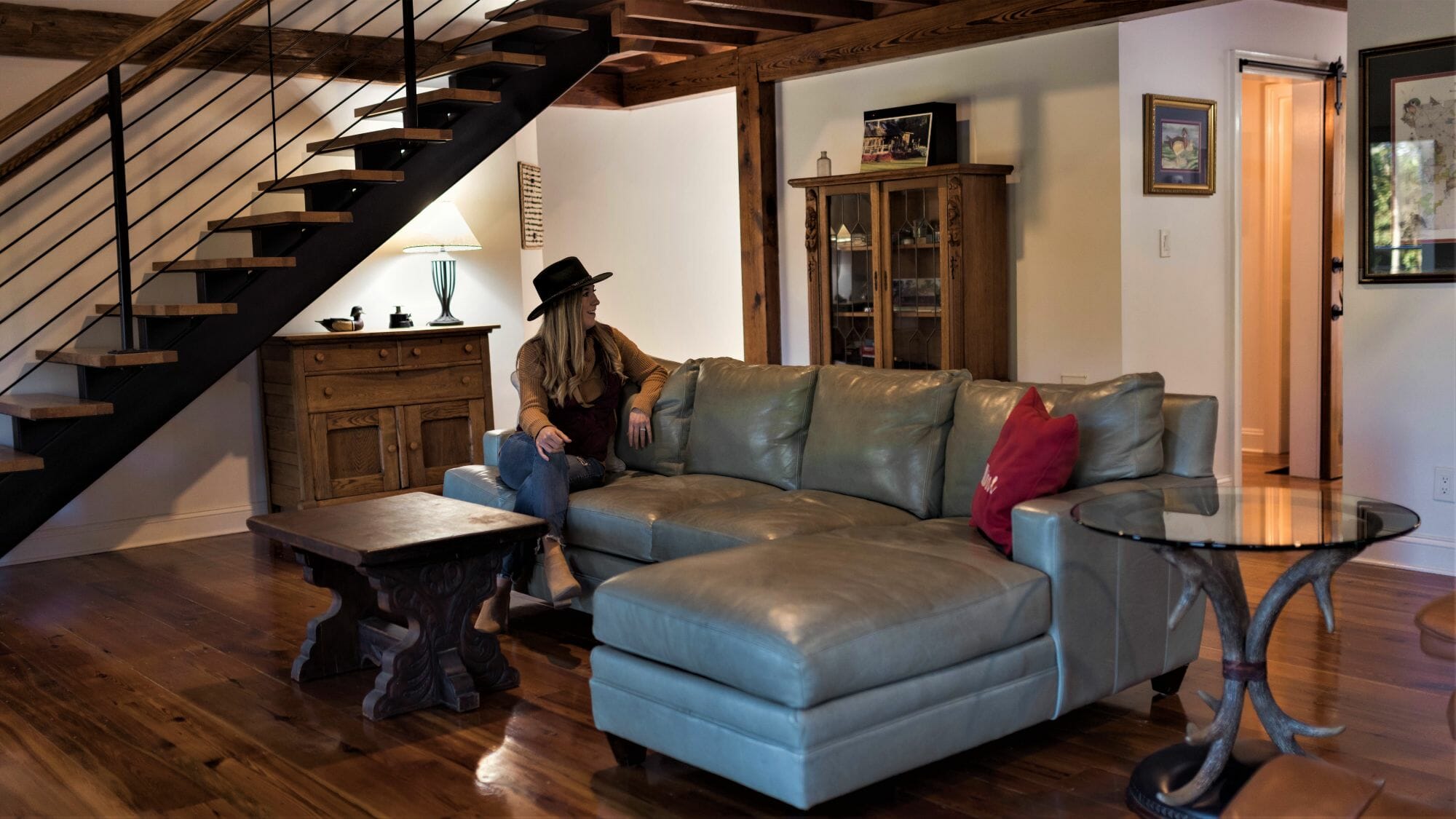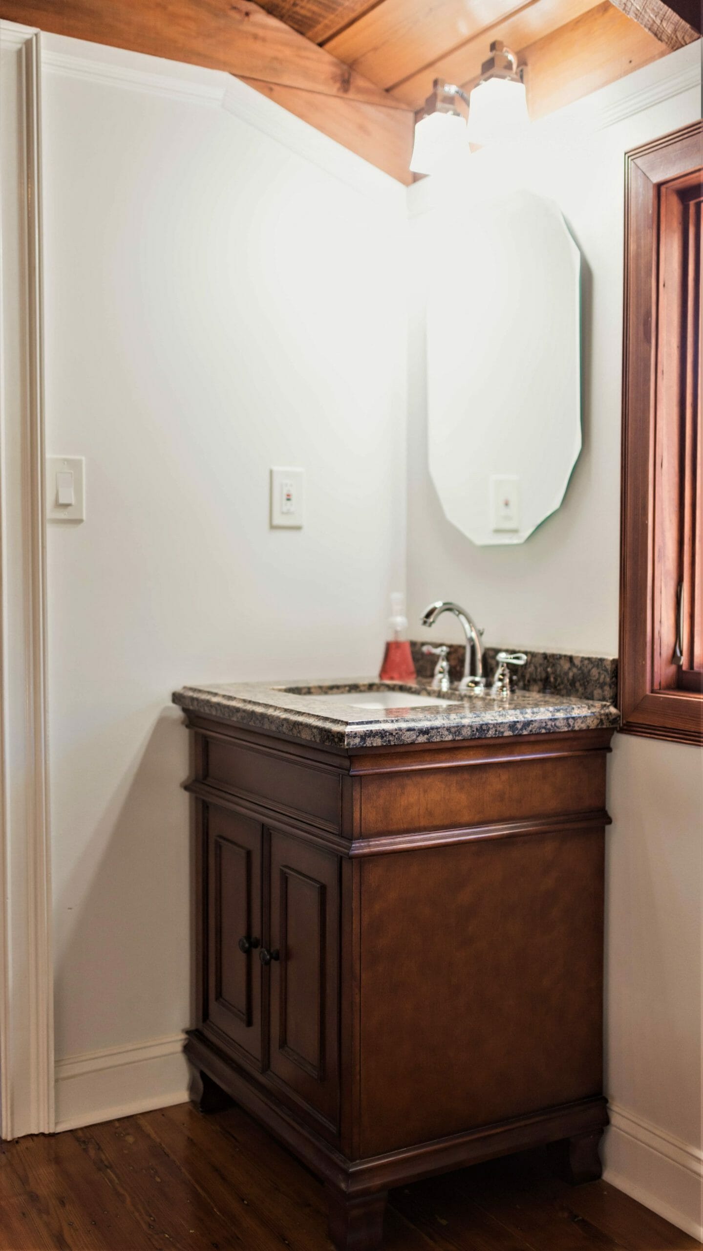- Pine floors, walls, and countertops; exposed ceiling beams