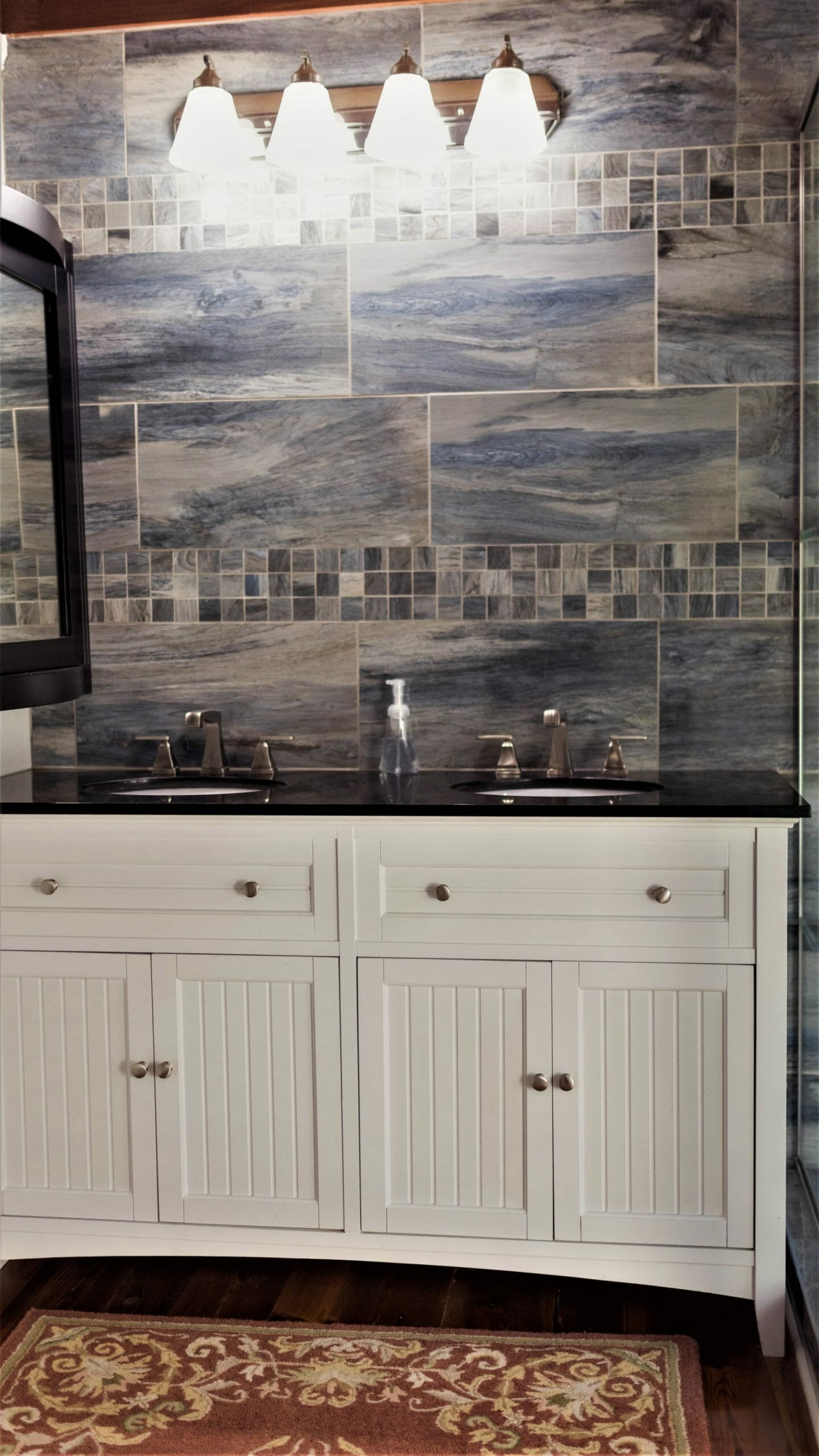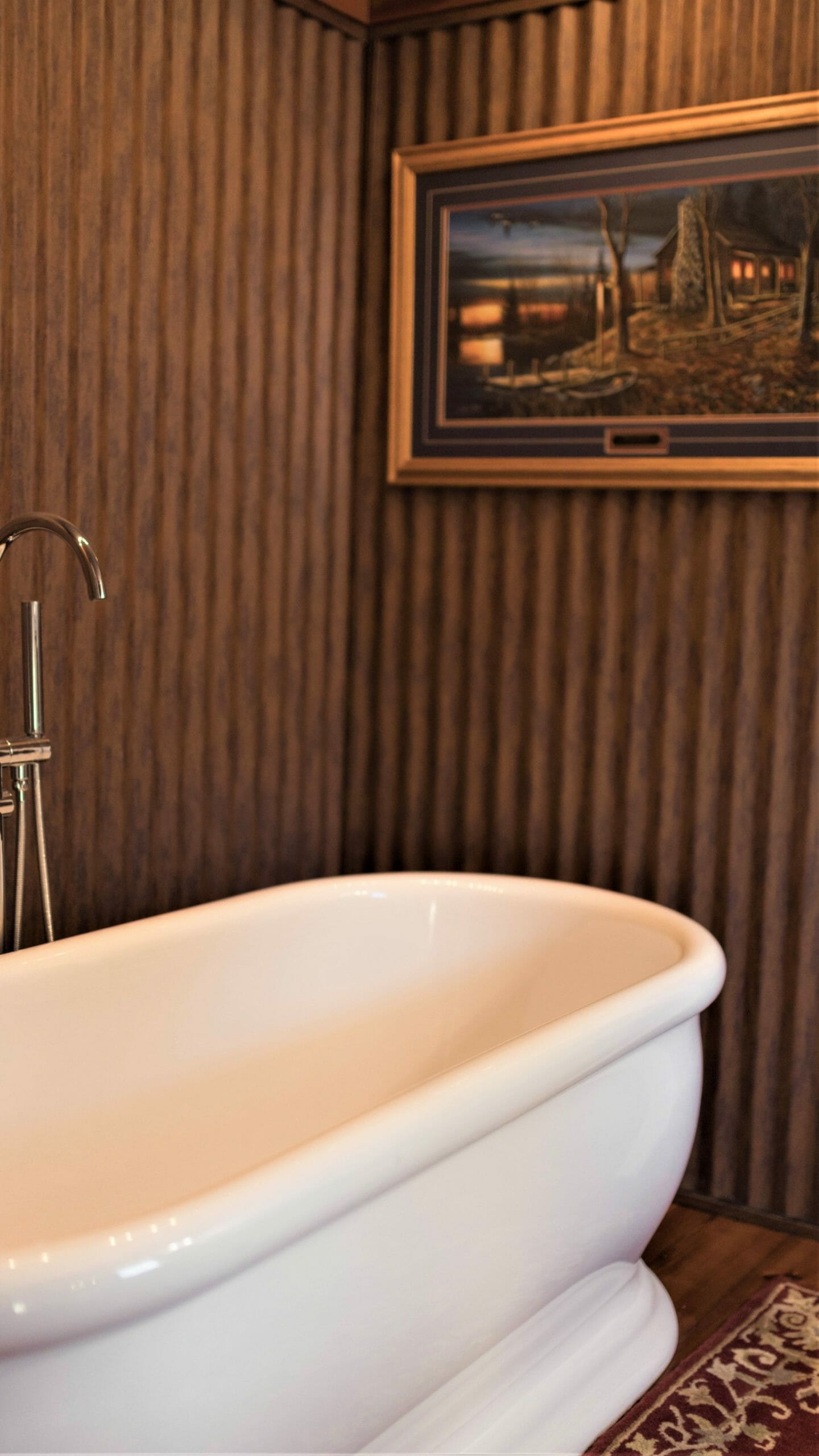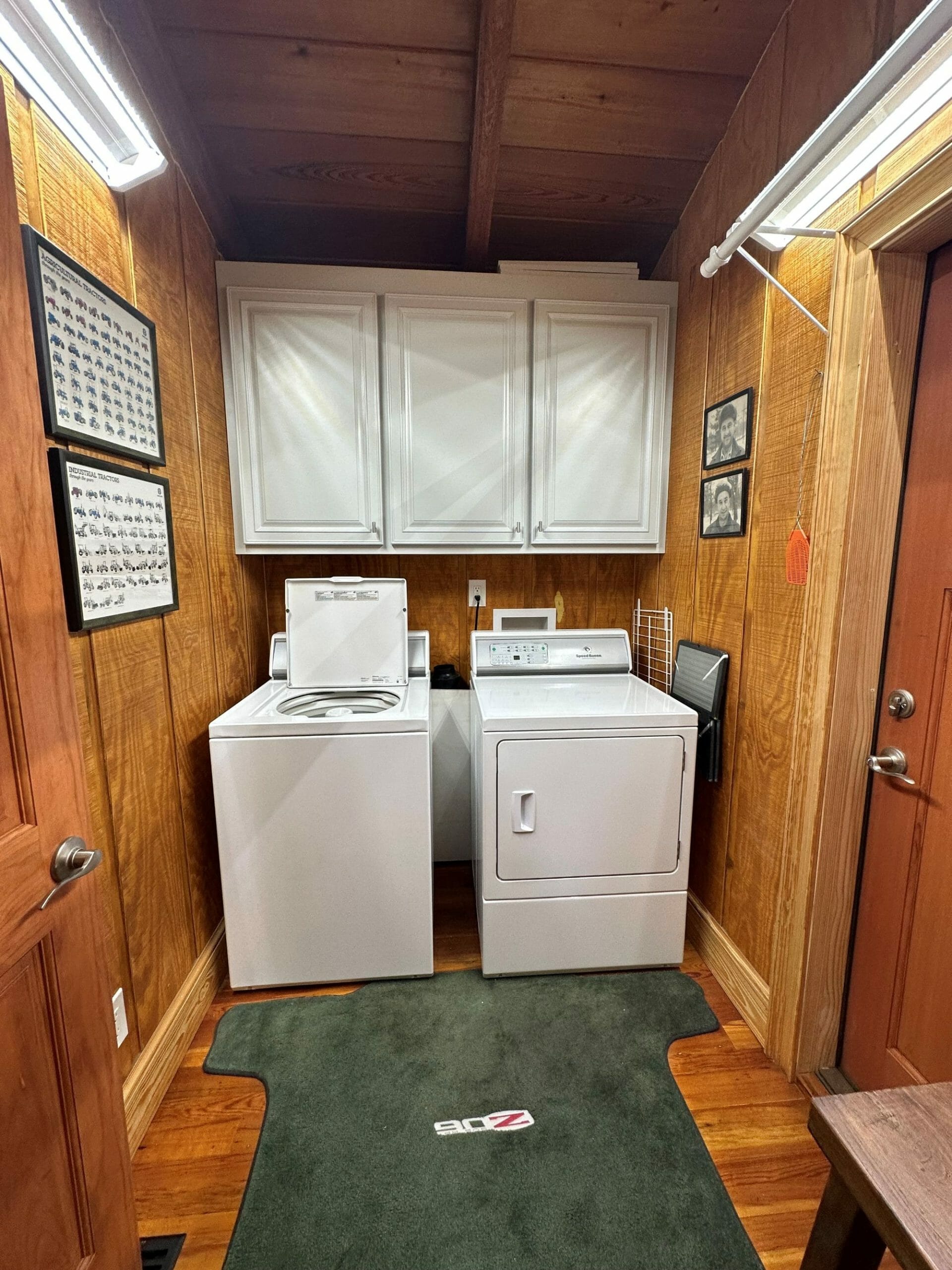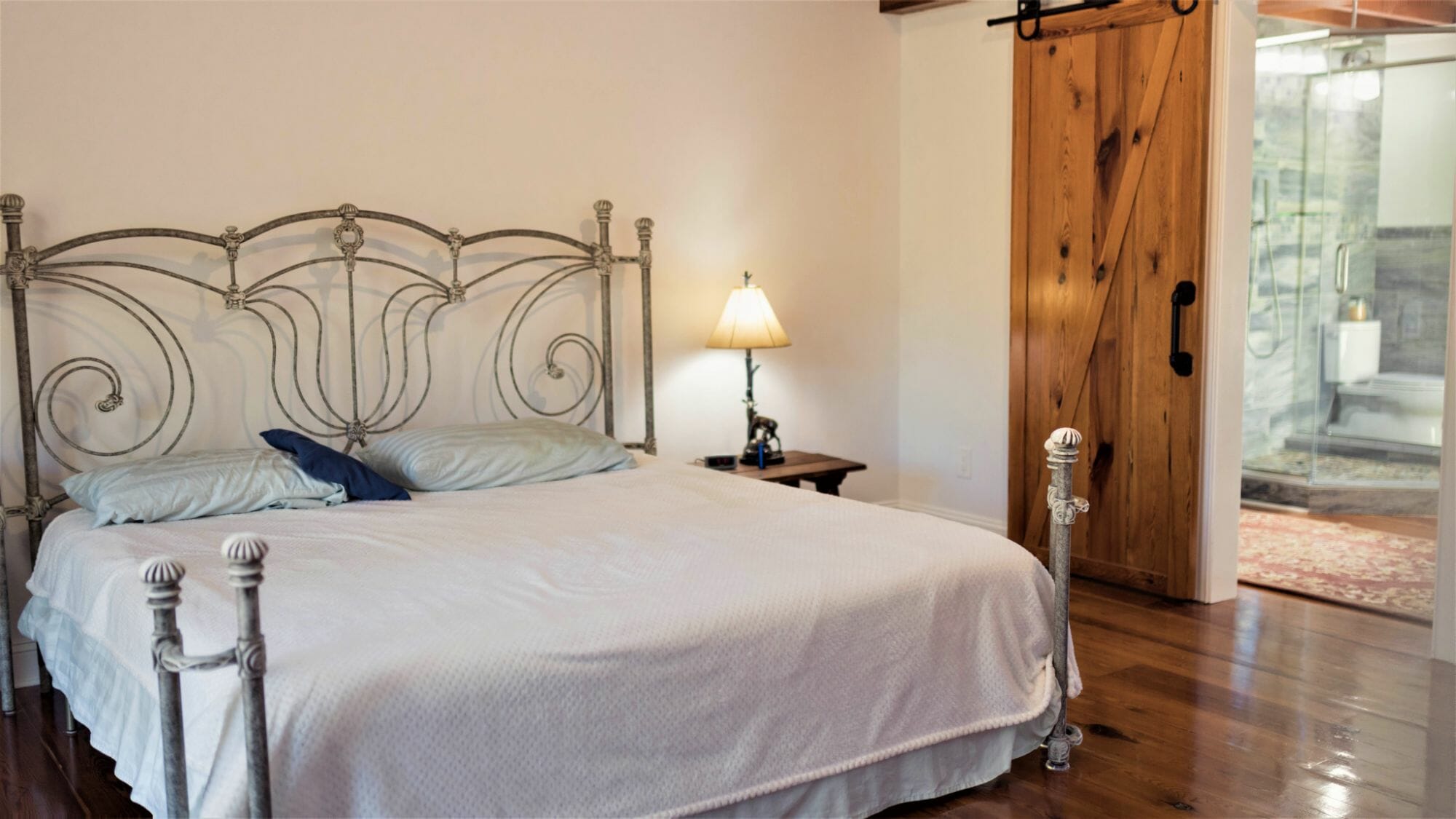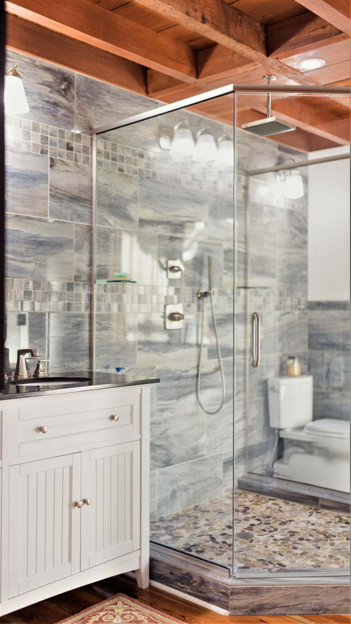 - Pine floors, walls, and countertops; exposed ceiling beams
