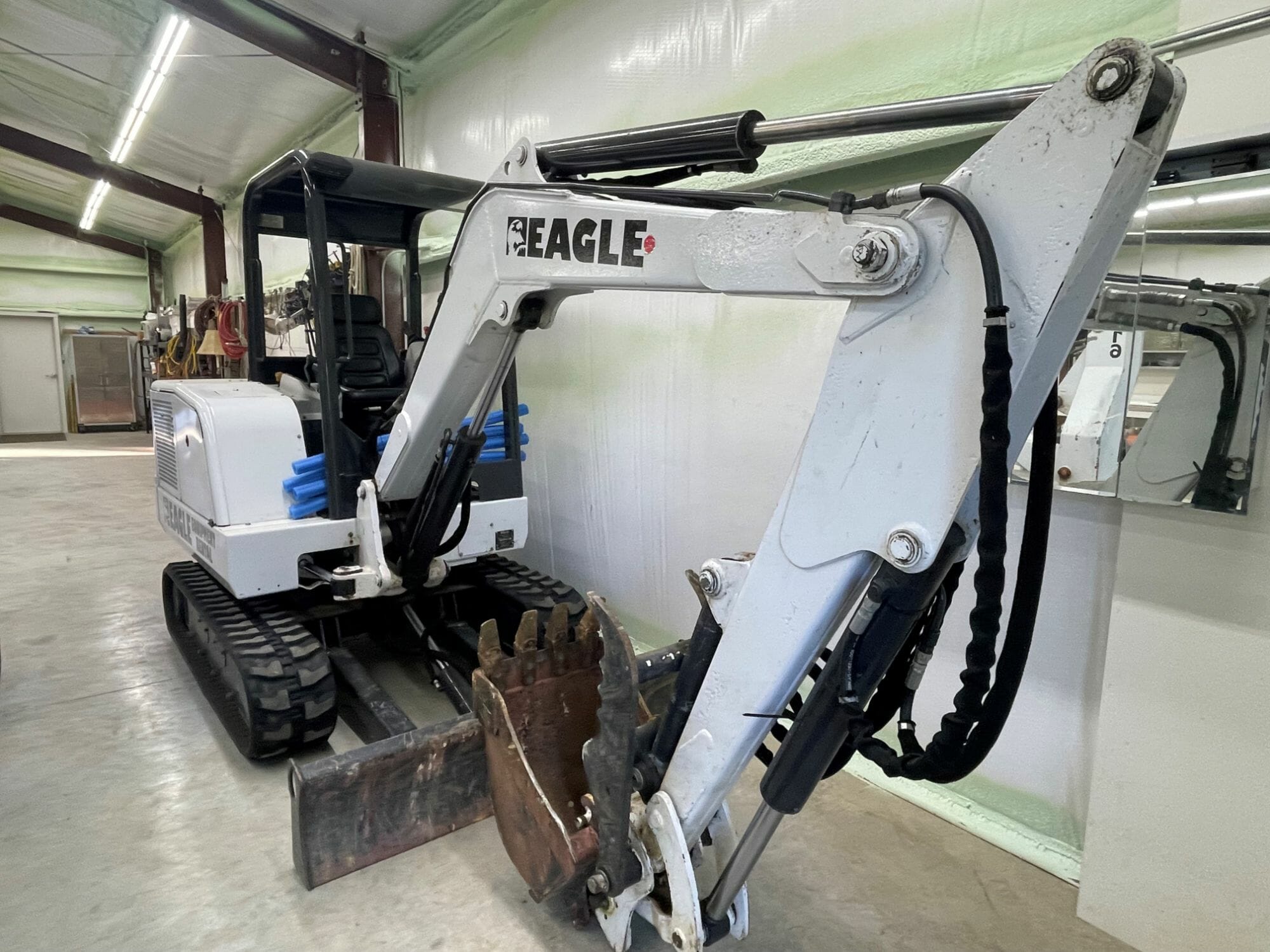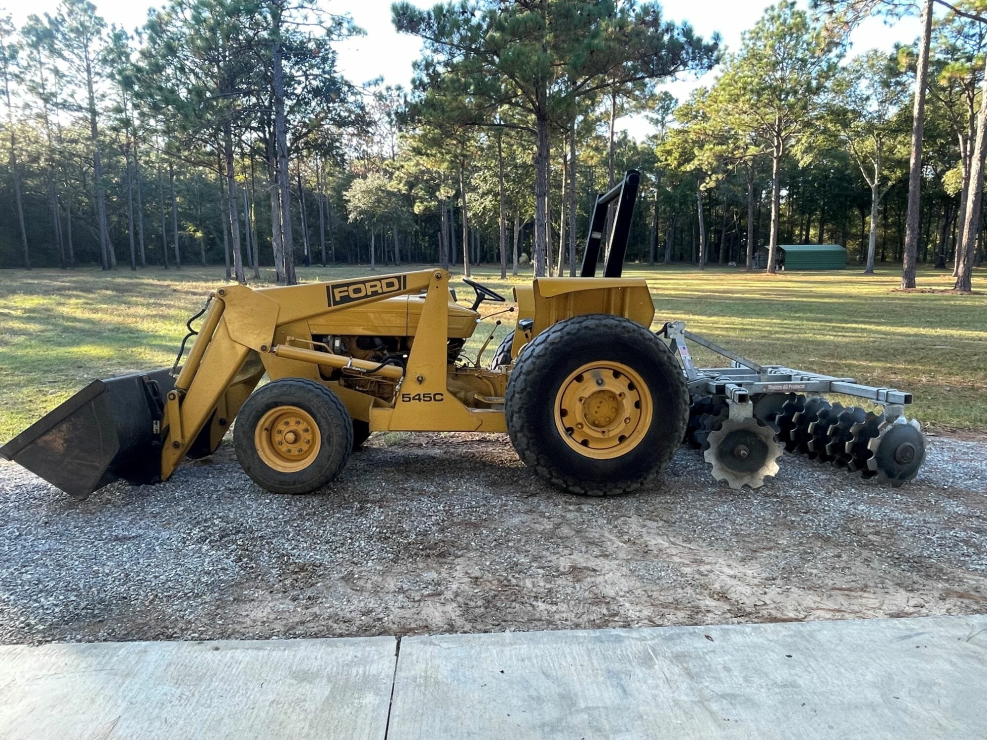 - Mini-excavator; mini-lift; Ford 454C tractor with front-end loader; disc, mower; one 16 ft aluminum John boat with 15 HP motor