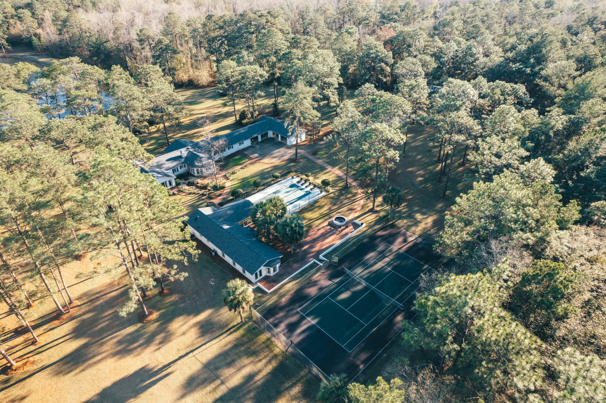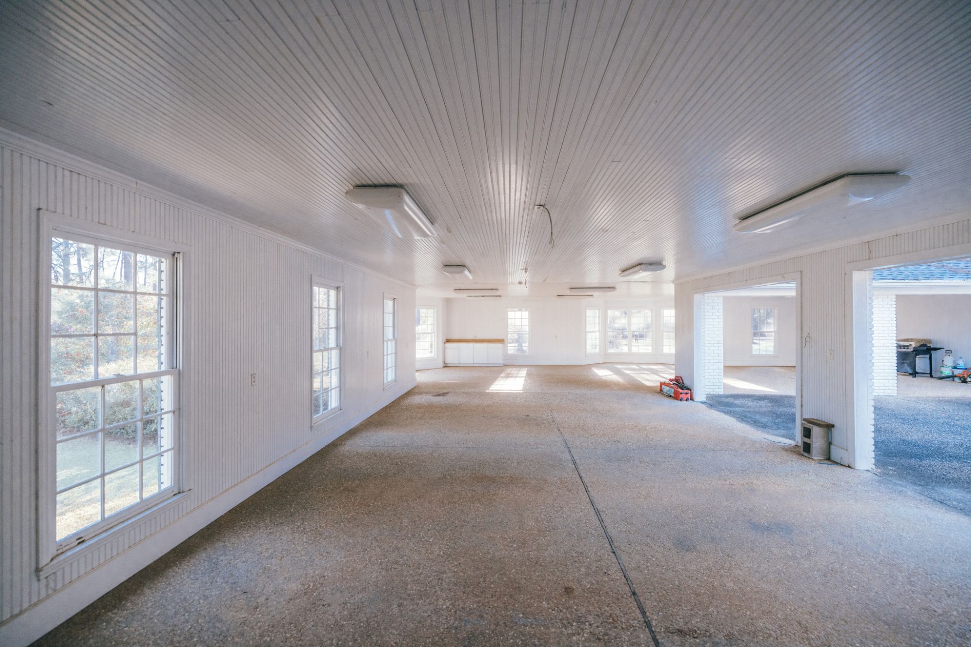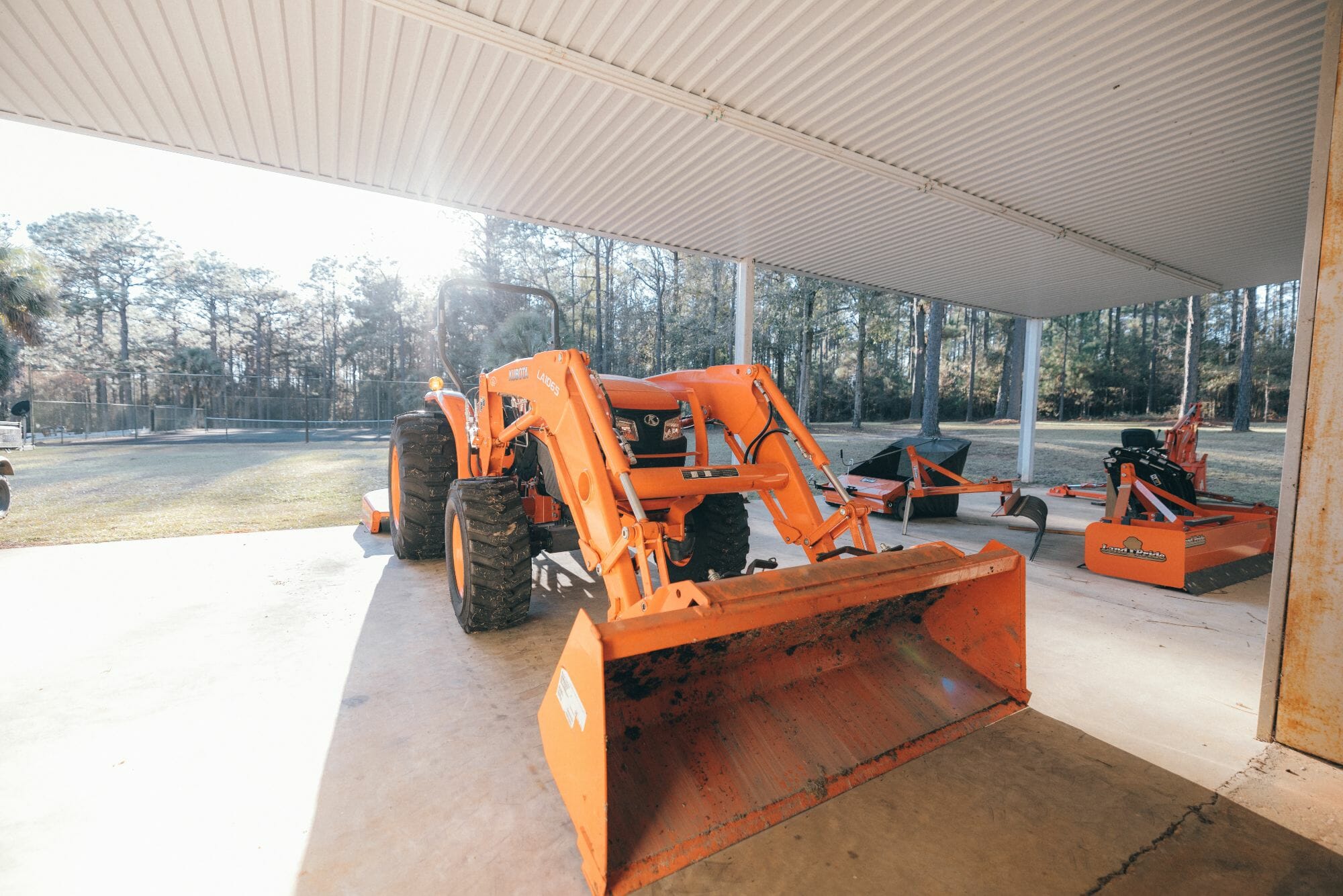 The 2250 sq ft metal equipment barn/shed is located next to the tree line and has plenty of space to park tractors, bush hogs, mules and all other farm equipment and tools. There is a large room in the barn that is AC controlled and was previously used to park and store antique cars. This area would make the perfect space for an industrial kitchen should a buyer decide to have weddings and events on property. The tennis courts could easily be covered with party tents to create the perfect space to house plenty of people for outdoors events.