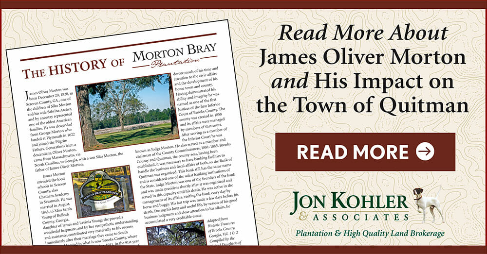 In 1843, James Oliver Morton and his new bride came from Savannah to unsettled Southwest Georgia. With this once-in-history opportunity, he had his choice of the finest land and timber in Georgia. The entrepreneur chose 4,000 acres located on what was then the Oglethorpe Trail, just a few miles southeast of present-day Quitman. His choice made him wildly successful. With more natural beauty and diversity than almost anywhere else in southwest Georgia, he picked an area of fertile soils and rolling pine-covered hills where the Withlacoochee River, Okapilo and Pisgola creeks converge. He prospered with this plantation and became one of the founding fathers of Quitman as well as both a Judge and founder of the Bank of Quitman, which is still in existence today.