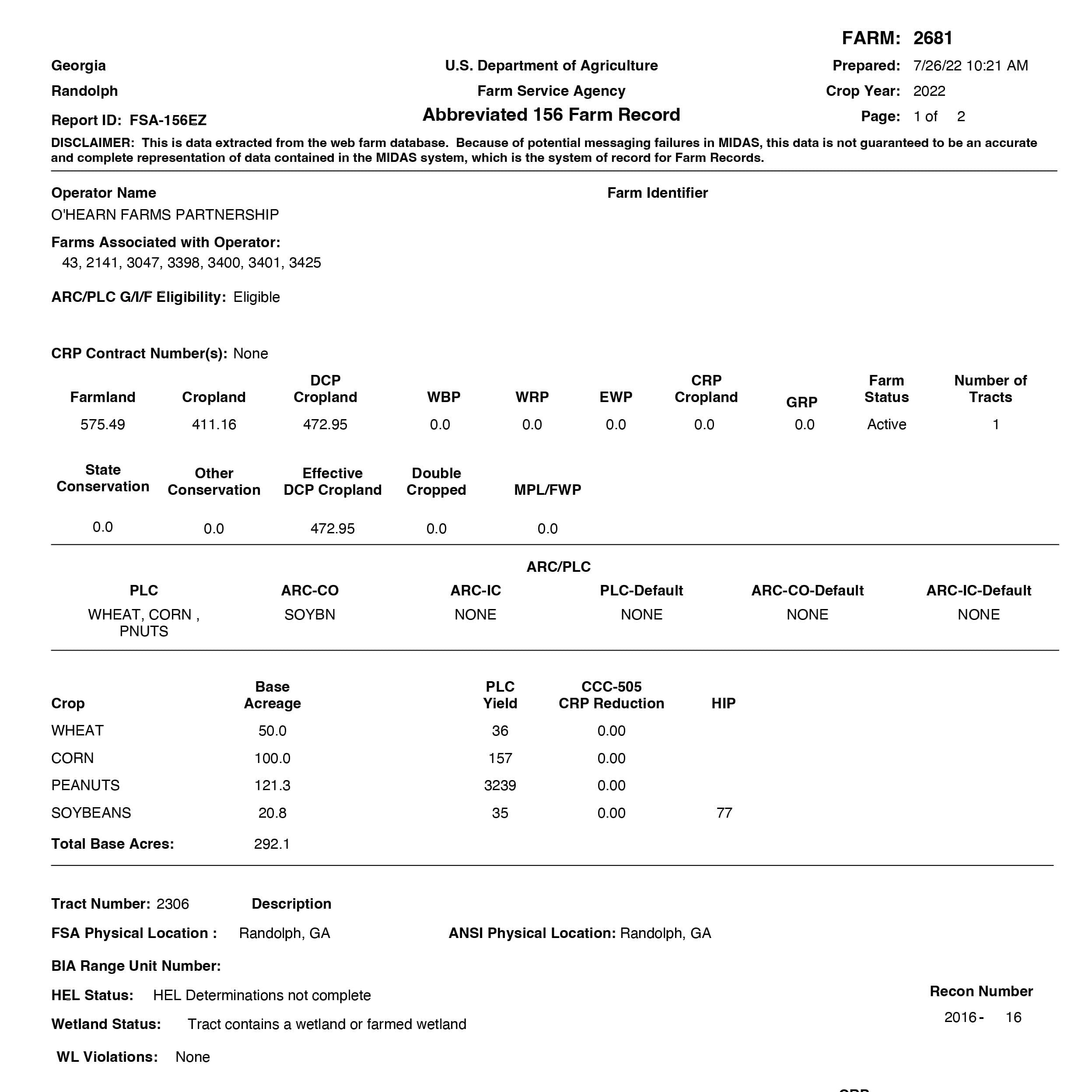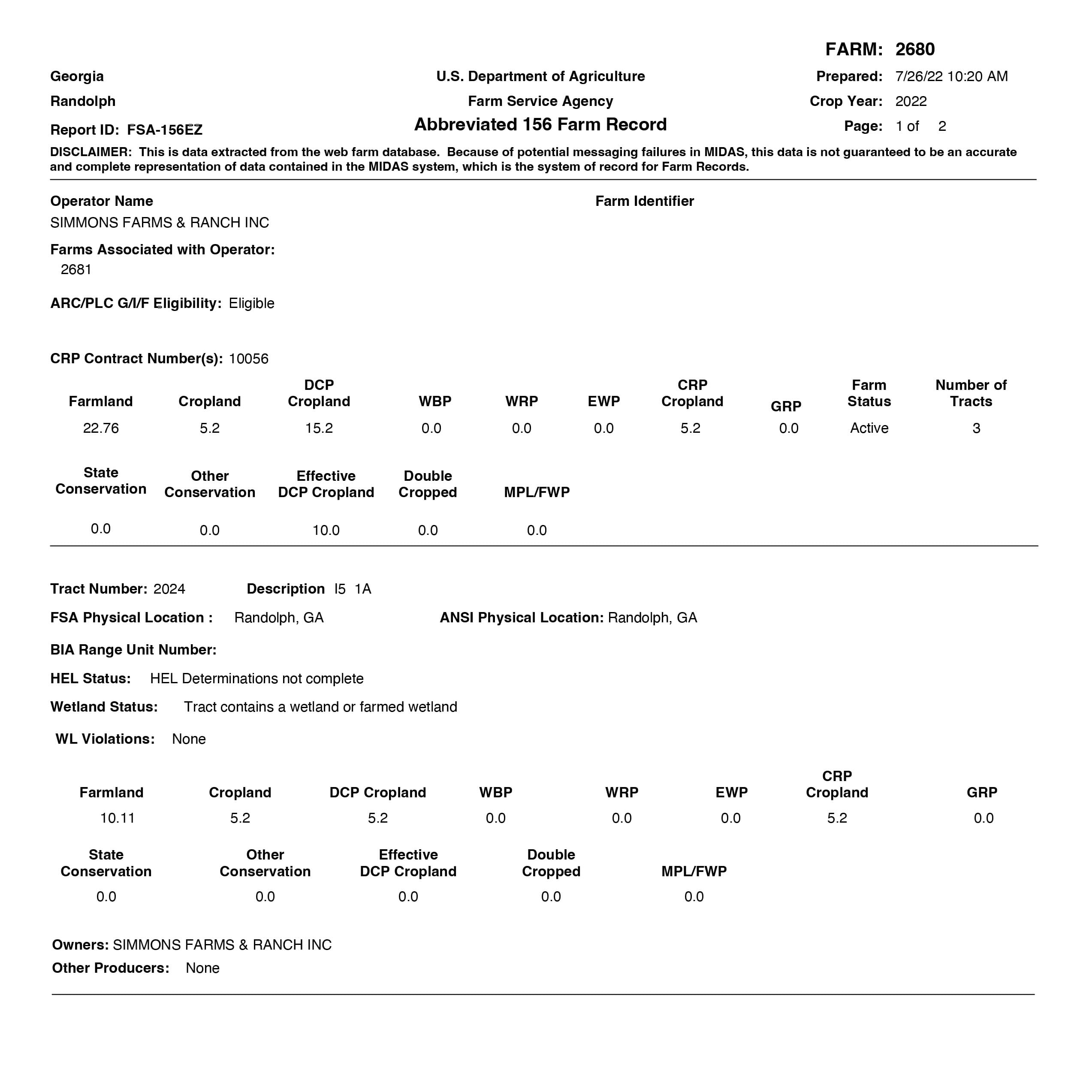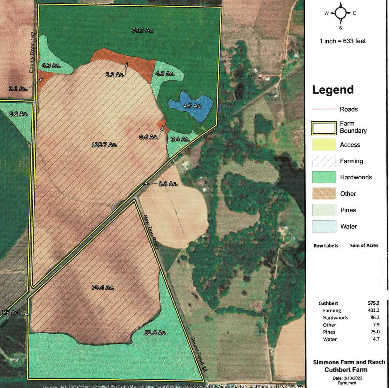 Of the approximately 588 acres, Simmons E G Farm consists of approximately 401 acres of quality farm land located in Randolph County, GA. Approximately 310 of the 401 acres are under pivot irrigation. The 9 tower Renke pivot is new. The additional Renke pivots are relatively new and in good working order. Great investment tract. Substantial timber value that needs to be harvested immediately. Good deer hunting. Nice hardwood areas around pond. There is substantial highway frontage for great access. Simmons E G Farm is not currently enrolled in CUVA.