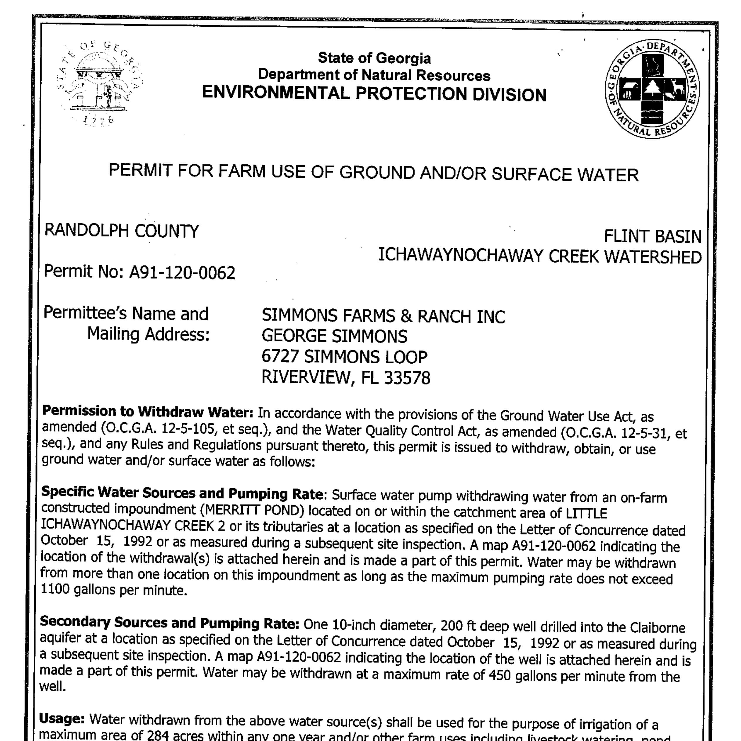 - Surface water permitted for 1,100 gals per minute; one electric deep well permitted for 450 gallons per minute that pumps into the 4.7 acre pond