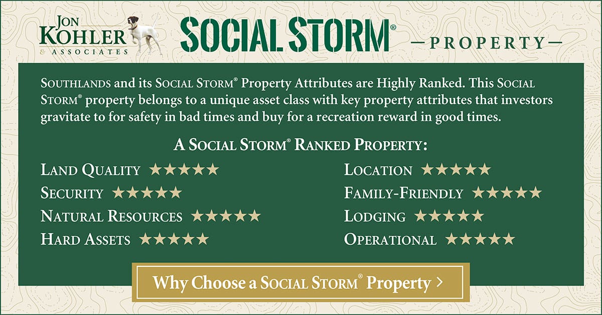 The good news is that a place like Southlands may be the perfect hedge. If America changes course and shifts back to its founding values and tomorrow’s a better day, Southlands will be enjoyed and appreciated as a high-quality recreational property, as it historically has. If America continues on its current path, it will be in even more demand and command even more value as a Social Storm™ Property. Nothing else during these times will provide both protection for your family and your wealth… dwarfing any benefits that a traditional safety net like gold or any stock certificate could possibly offer. The look on your family's face during the next pandemic when your investment portfolio offers nothing to them when it could have is not something any of us wants to see again.