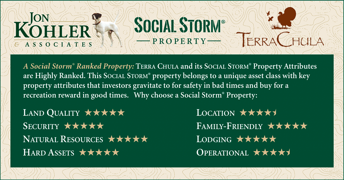 Terra Chula also shares an additional value feature that makes it even more unique. In our experience of selling over $1B in properties like this, over three decades in all types of markets, we recognized that some properties were sought out not only for recreation and enjoyment but also as a place for protection and wealth preservation during bad times. These are places where during the next pandemic, or whatever comes after, families can get together. Over time, we developed a 10-point scorecard for measuring these attributes and a decade ago we trademarked the term Social “Storm Properties.” Terra Chula is an exceptional social storm property.