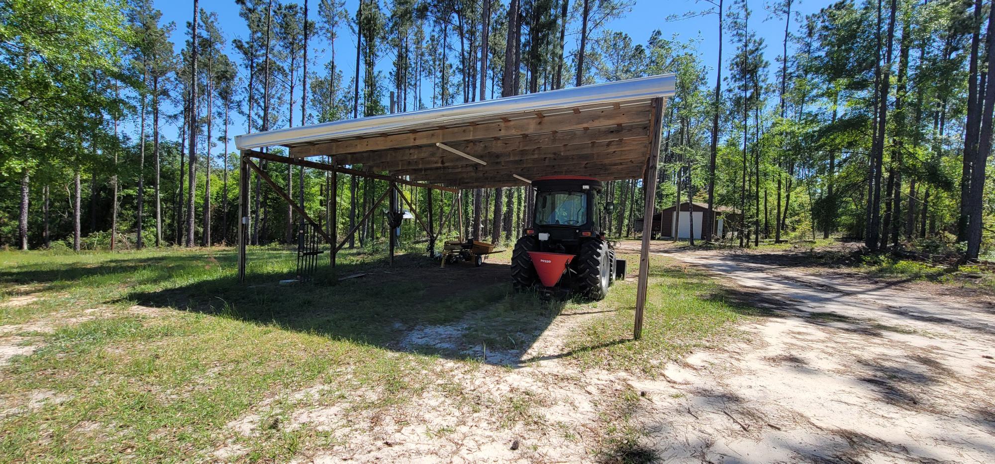 A comfortable three-bedroom, two-bath home sits at the heart of the property, featuring hardwood floors, spacious porches, and a fire pit for gathering after a day in the field. A 40x30 pole barn and a 20x30 metal garage/workshop offer ample space for gear and equipment, while a Mahindra 3500 tractor with implements is included for property maintenance.