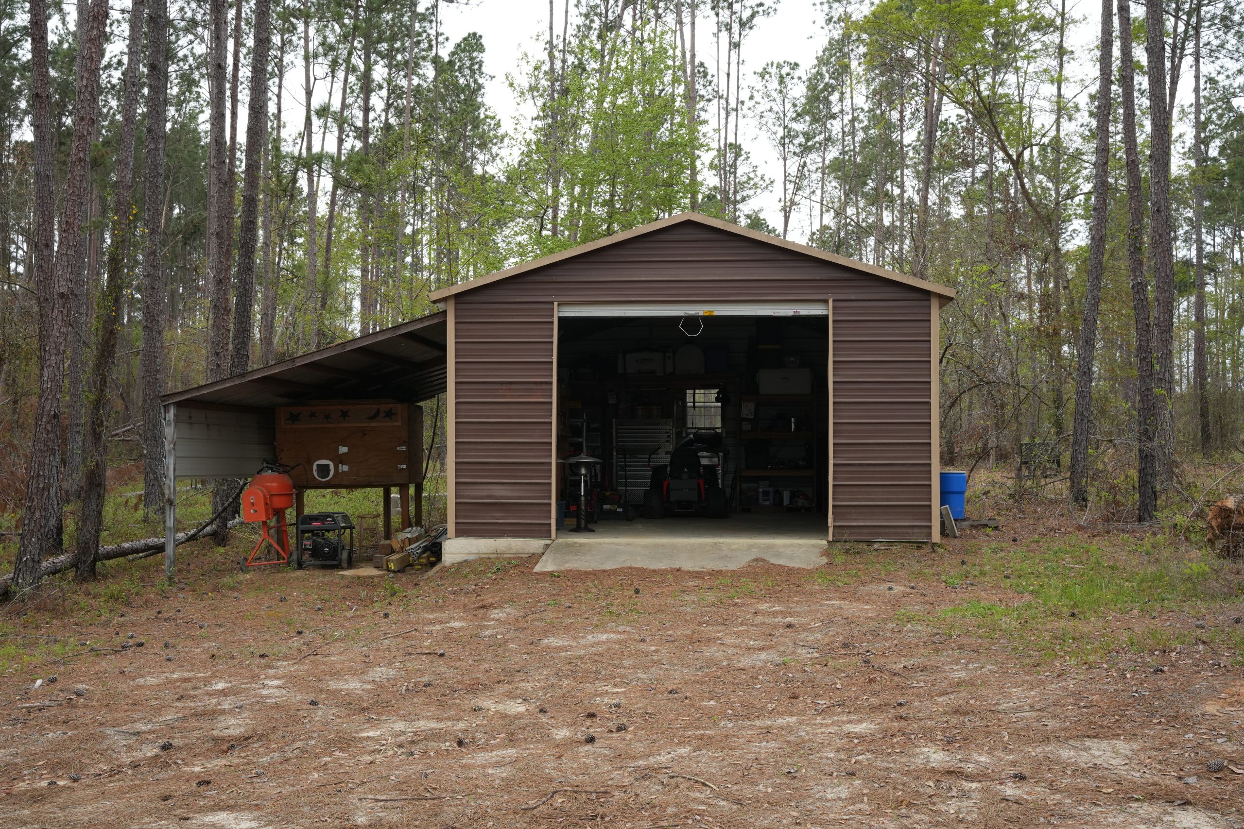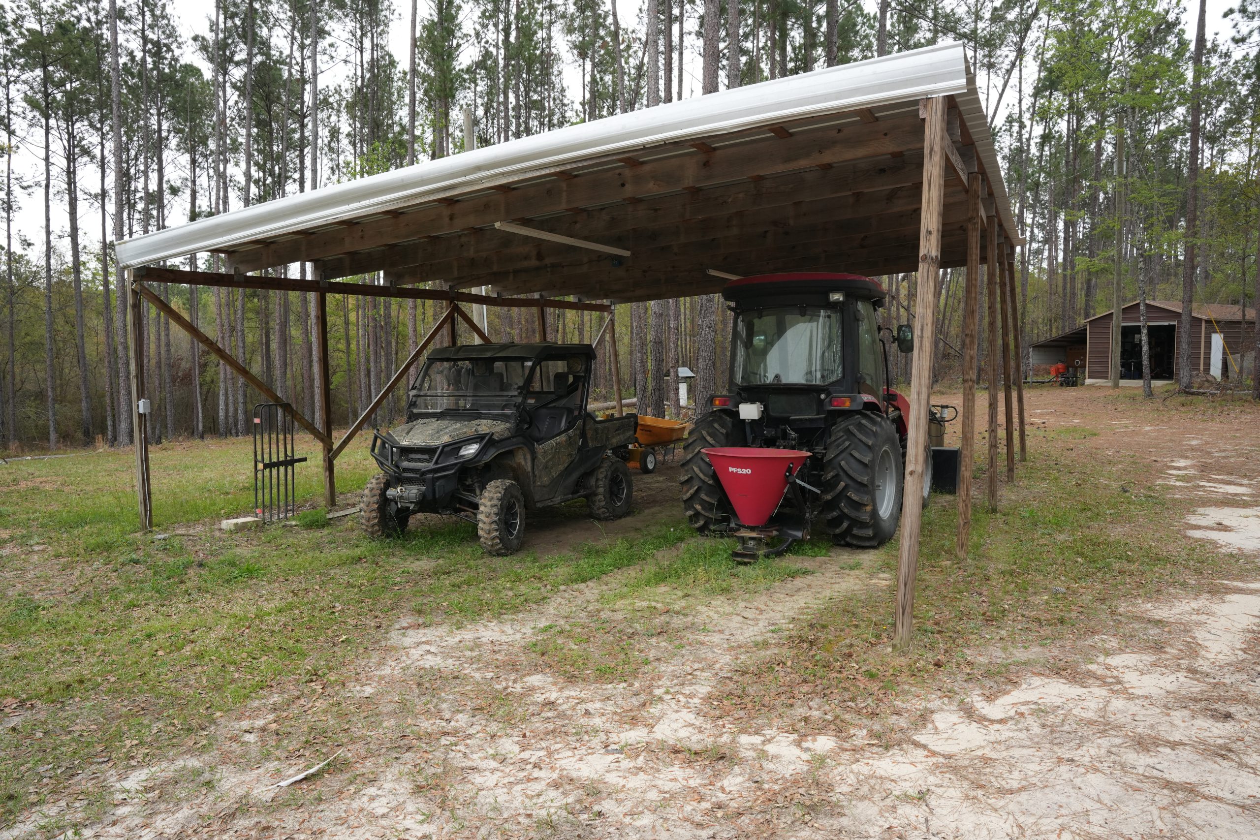 - Includes 40x30 pole barn, 20x30 garage/workshop, and Mahindra 3500 tractor with implements